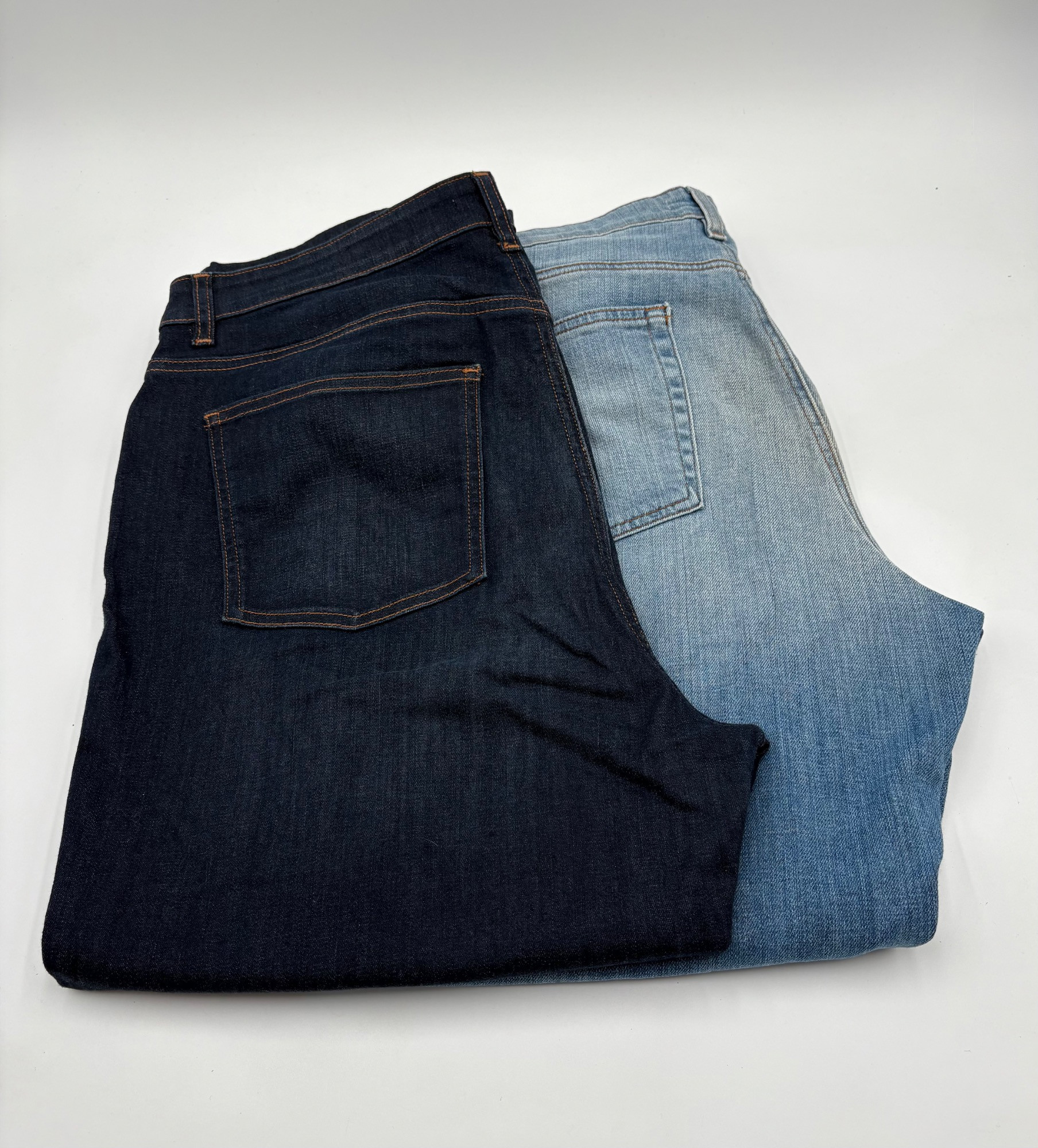 Two pairs of Eileen Fisher blue denim jeans. Darker pair appears to be somewhat cropped with slightly tapered legs, gold top-stitching, zip fly front, and classic 5-pocket design. 84% cotton with 14% polyester and 2 % spandex. In good used condition. Measures 19" side to side at waist with 25" inseam. Size tag says 16. Lighter pair has tapered legs, gold top-stitching, zip fly front, and classic 5-pocket design. 98% cotton with 2% spandex. In good used condition. Measures 20" side to side at waist with 29" inseam. Size tag says 14.
