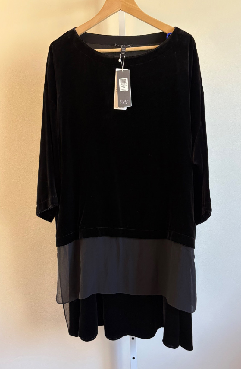 Lovely black velvet tunic and skirt from Eileen Fisher. Can be worn separately or together. Super soft velvet tunic top has rounded neck, dropped shoulders, and 3/4 length sleeves. Attached to the hem of the overshirt is a silk section with a matte surface for great contrast to the shiny velvet nap. The silk insert is split at the hem with the rear hem approximately 4" longer than the front hem. New with tag. Velvet portion is 82% rayon with 18% silk while the lower section is 100% silk. Measures 25.5" pit to pit and 34" from back neckline to bottom of back hem. Size tag says L/G. Skirt has wide stretchy spandex waistband for comfort and side panels for more swing; falls mid-calf length or lower on most women. In excellent condition. 80% rayon and 18% silk with 2% spandex. Measures 18.5" side to side at waist and 34" from back waist to bottom of hem. Size tag says XL.