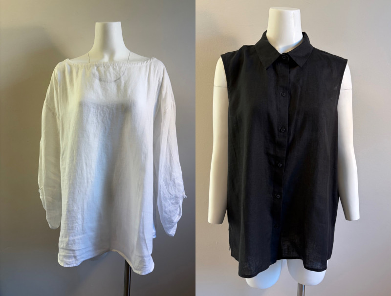 Black & white summertime tops from Eileen Fisher. Simple white scoop neck top with tied cuffs, dropped shoulders, and curved hem. In excellent condition but has very slight discoloration along collar (very very slight; doesn't show in photos - needs to be laundered). 100% linen. Measures 26" pit to pit and 28" from back neckline to back bottom hemline. Size tag says XL. Black sleeveless top with collar, button front closure, and split hem. In excellent condition. 100% linen. Measures 25" pit to pit and 26" from back neckline seam to bottom back hem. Size tag says 1X.