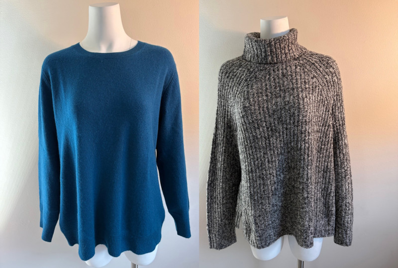 Pair of contrasting weight sweaters from Neiman-Marcus & Old Navy. Saturated teal crewneck sweater from Neiman-Marcus has ribbing around the neckline, cuffs, and hemline. In excellent condition. 100% cashmere. Measures 24" pit to pit and 27" from center back neck seam to back hemline. Size tag says 2X. Marled grey & white sweater from Old Navy has turtleneck, raglan sleeves, and ribbing on turtleneck, cuffs, and split hemline. Back hem is approx. 2" longer than front. In excellent condition. 61% cotton with 39% acrylic. Measures 24.5" pit to pit and 24.5" from center back neck seam to back hemline. Size tag says XL.