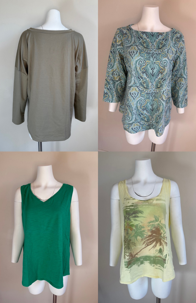 4 casual shirts for everyday wear from various makers. Yellow tank from Old Navy with tropical print is in good condition. 100% cotton. Measures 21" pit to pit and 25" from back of scoop neck to bottom back hem. Size tag says XL. Green V-Neck tank from Chico's has ribbing along the neckline and armholes. In good used condition. 60% cotton with 40% modal. Measures 22" pit to pit and 25" from back of scoop neck to bottom back hem. Size tag says 3. Abstract patterned top from Charter Club has decorative buttons on left shoulder, 3/4 sleeves, and a curved hem. In good used condition. 100% cotton. Measures 22" pit to pit and 25" from back of neckline to bottom of back hem. Size tag says 1X. Pale green/beige long-sleeve top from J. Jill has ribbed collar. In excellent condition. 75% polyester with 21% viscose and 4% spandex. Measures 22" pit to pit and 28" from back of neckline to bottom of back hem. Size tag says L.