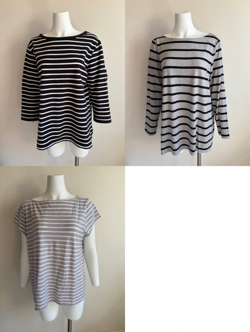 Trio of striped shirts, all in stretch knit from Eileen Fisher & White Stag. Black & grey curved neck top with long sleeves from Eileen Fisher. In excellent condition. 95% Tencel with 5% spandex. Measures 23” pit to pit and 27.5” from back neckline to bottom back hem. Size tag says XL. Grey & white curved neck top with cap sleeves & split hem from Eileen Fisher. In excellent condition. 100% cotton. Measures 23" pit to pit and 24" from back neckline to bottom back hem. Size tag says XL. (Lighter knit than the previous top - more like a t-shirt weight) Black & white top from White Stag with 3/4 length sleeves, ribbing around the neckline, left sleeve pocket, and split hemline. In excellent condition. 97% cotton with 3% spandex. Measures 2" pit to pit and 25.5" from back neckline to bottom back hemline. Size tag says XL.