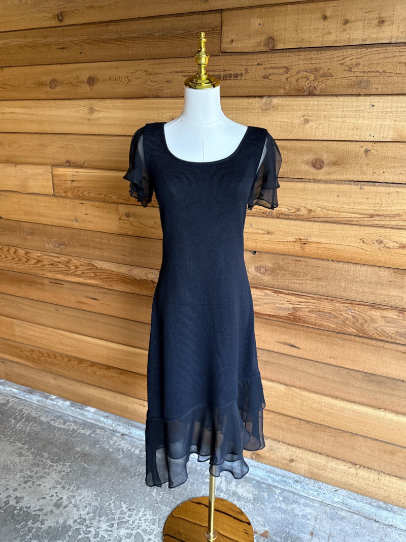 ST JOHN Evening Black Knit Dress w/ Chiffon Ruffles- Sz 2