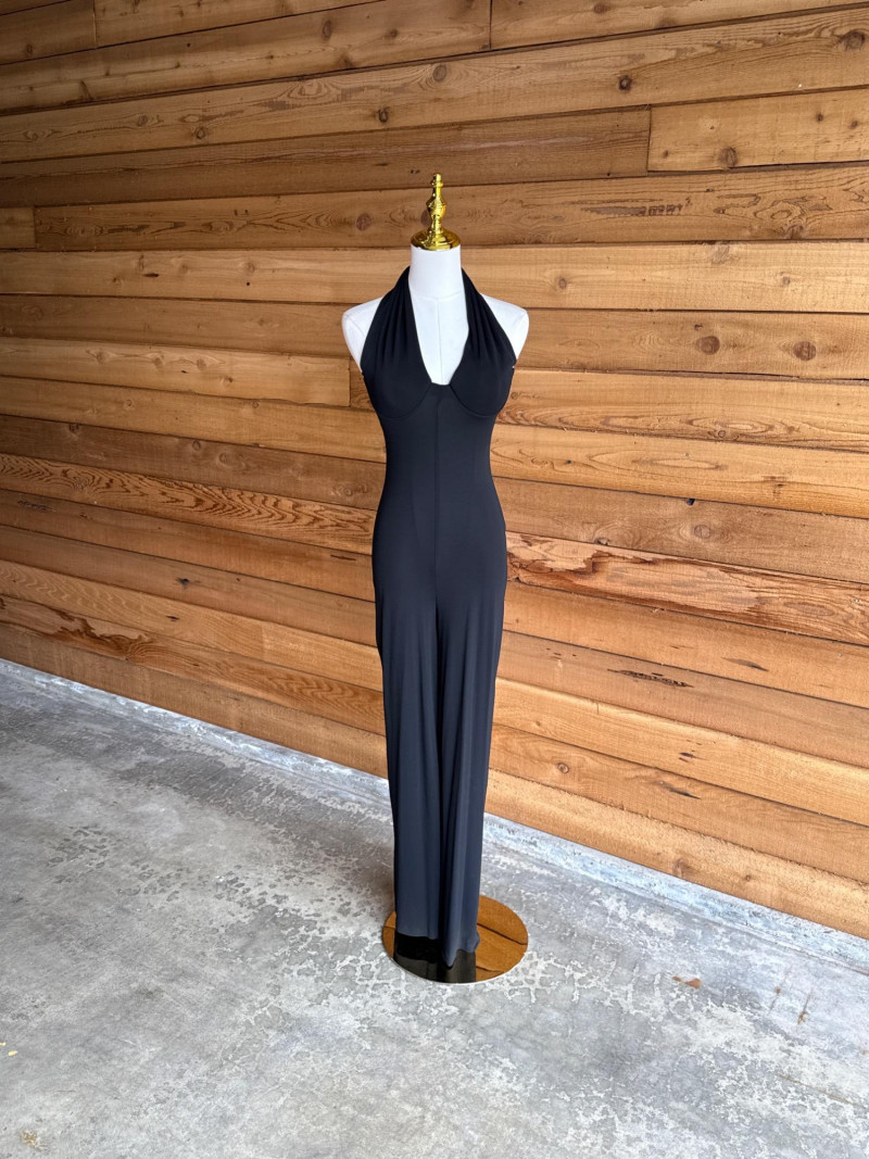 Black Halter Pant Suit Stretch material. Soft knit. No size tag Would estimate it to be about a xs/s. Has moulded bra cups.