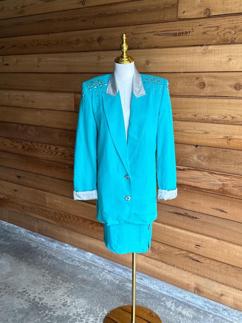 CRISCOINE Vintage Aqua w/ Leather Collar Skirt Suit- Sz XS