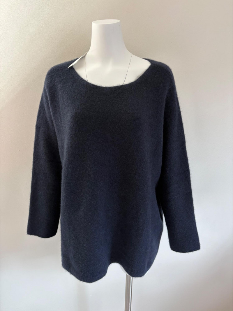Heavyweight midnight blue/black cashmere sweater from Eileen Fisher has rounded neck, dropped shoulder seams, and straight-cut body. New with tag. 72% cashmere, 17% silk, 10% nylon, and 1% elastane. (Blending silk with with cashmere reduces cashmere’s tendency stretch out of shape without affecting its soft hand or significantly reducing its insulating properties.) Measures 26.5" pit to pit and 26" from center back neck seam to back hemline. Size tag says 1X.