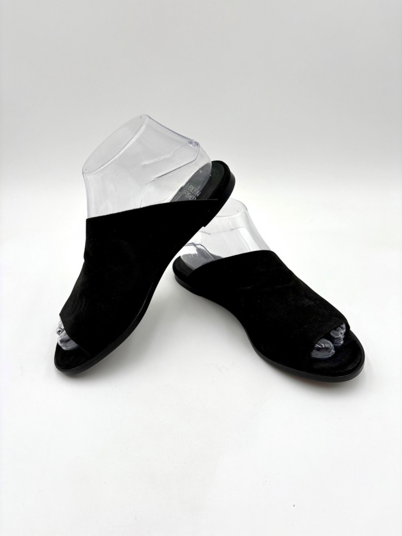 Soft black leather slides from Eileen Fisher. Black leather soles, smooth black leather insole, and soft suede wrap upper. Open toe. Appear to be new with virtually no soiling on soles - probably just worn to try on. Size 7