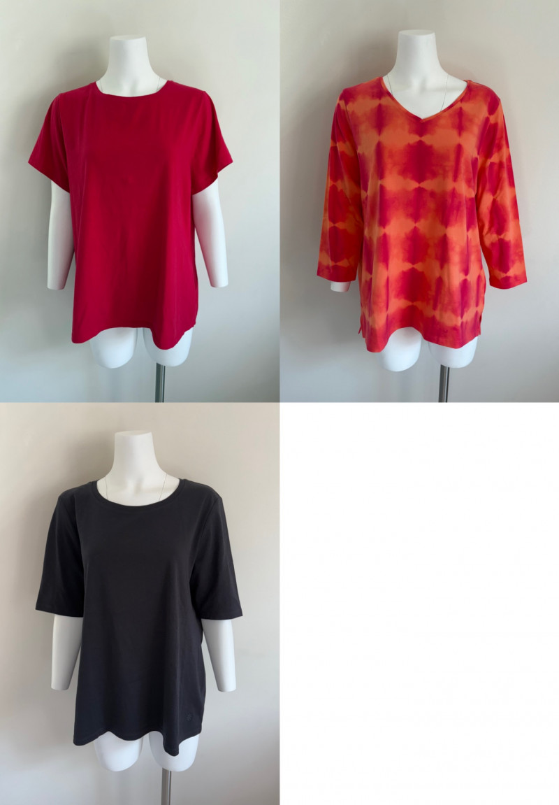 Three knit shirts from Isaac Mizrahi & Massimo. Black scoop neck short sleeve shirt from Mizrahi has ribbed collar and straight cut - knit is heavier than your average t-shirt. In excellent condition with no fading. 100% cotton. Measures 22" pit to pit and 25.5" from back collar to back bottom hemline. Size tag says XL. Tie-dye V-neck shirt from Mizrahi has ribbed collar, 3/4 sleeves, and split hem - knit is heavier than your average t-shirt. In excellent condition with no fading. 100% cotton. Measures 22.5" pit to pit and 26.5" from back collar to back bottom hemline. Size tag says L. Red t-shirt from Massimo has curved neckline and very short sleeves. In excellent condition. 95% cotton with 5% spandex. Measures 23" pit to pit and 26" from back neckline to back hemline. Size tag says16W/18W.