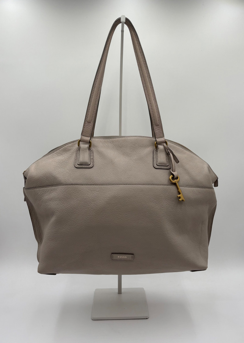 Roomy beige-grey leather purse from Fossil. Curved upper edge, squared off base, zip close top, back exterior slide pocket, and reinforced strap attachments with gold hardware. Interior has center zip compartment and two compartments on either side - one with a zipped pocket, the other with darted slide pocket. Clean and in very good used condition with a small pen mark on the inside label. Fossil label plate on exterior front. Measures 11" H x 13.5" W with a 9" drop from top of the hand straps to the top of the purse.