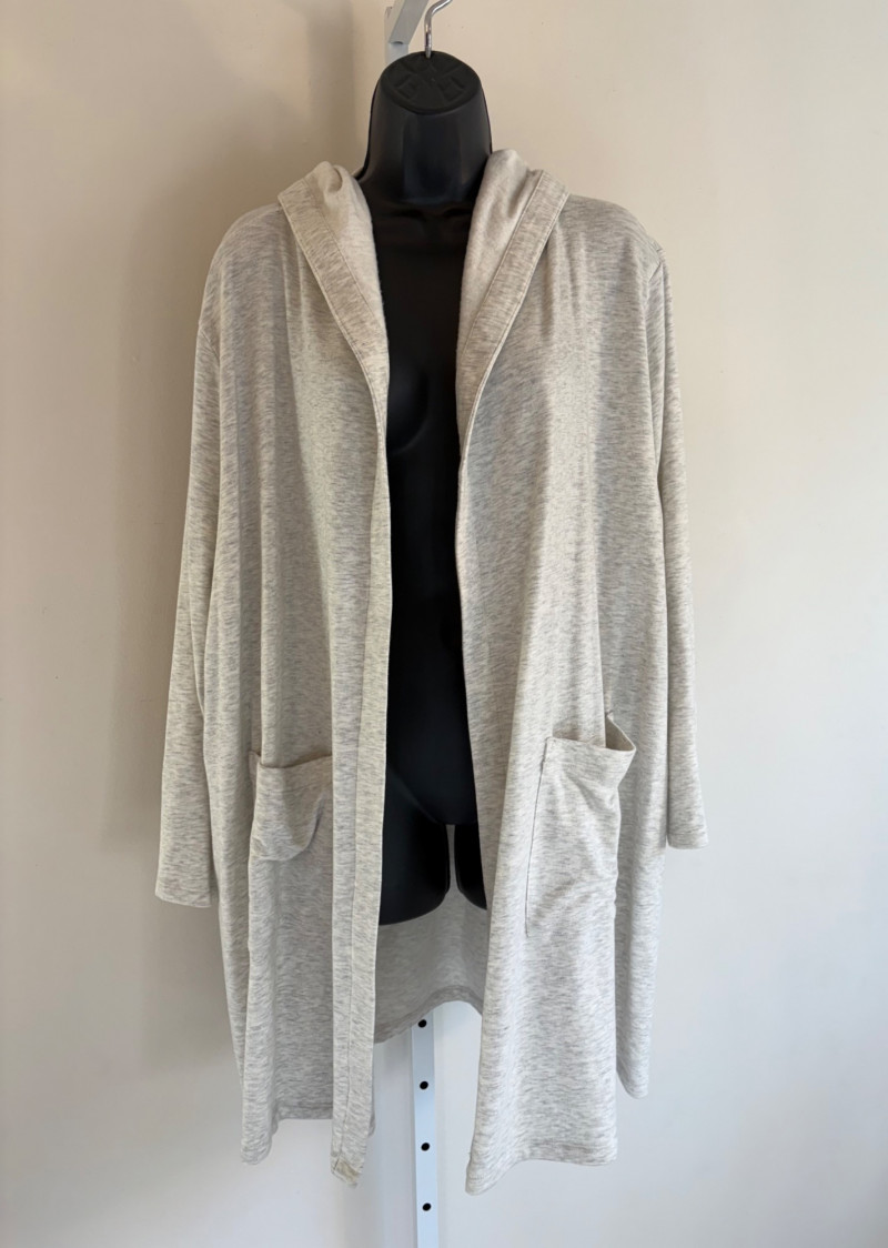 Wonderful pairing From Eileen Fisher of a long white/grey Tencel cardigan & deep grey-green linen tank. Grey-green tank has narrow banding along neckline & armholes. In excellent condition. 100% linen. Measures 23"pit to pit and 21.5" from back scoop neck to bottom hem. Size tag says XL. White-grey super soft cardigan has long sleeves, open front with patch pockets, and hood with interesting construction. In excellent condition. 65% Tencel with 28% cotton and 7% elastane. Measures 25" pit to pit and 33" from back neck seam to back bottom hem. Size tag says 1X.