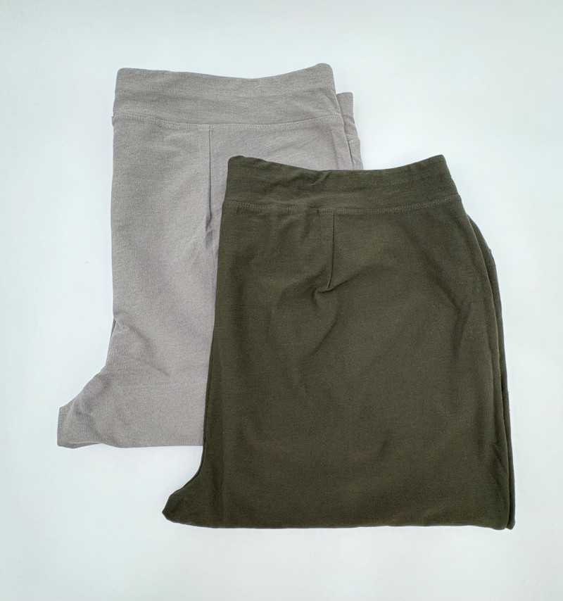 Two pairs of slim stretch pants perfect for under a long sweater or larger shirt/jacket. Both pairs have a wide flat elasticated waistband, back waistline hip darts, and a slim leg. Both are in excellent condition and are made of 70% viscose with 24% nylon and 6% spandex. Dark green pair measures 18.5" side to side at waist with 28" inseam. Size tag says XL. Medium grey pair measures 19" side to side at waist with 28" inseam. Size tag says XL.