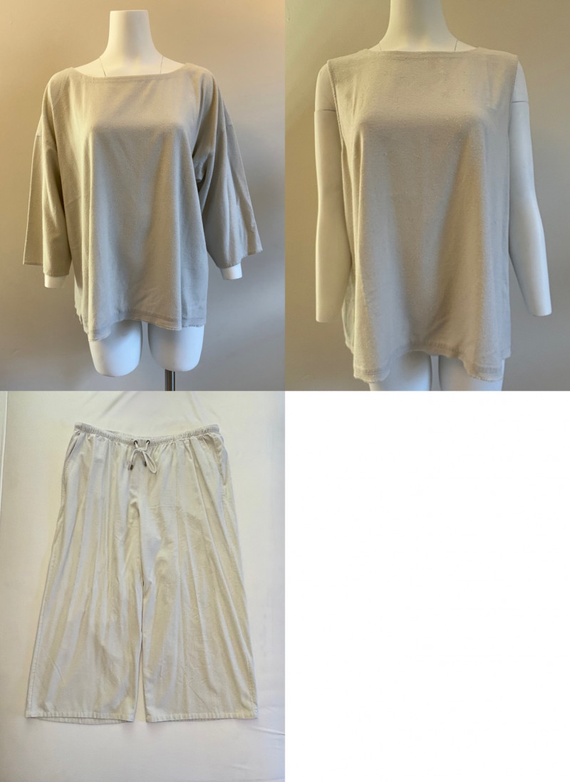 Three wonderful ivory separates in silk noil from Eileen Fisher. Simple curved neck shell has single button back neck closure and purposely frayed hem band. In very good used condition. 100% silk noil. Measures 23" pit to pit and 24" from back neckline to back hemline. Size tag says XL. Long sleeve top has curved neckline and purposely frayed split hem band. In very good used condition. 100% silk noil. Measures 25.5" pit to pit and 24.5" from back neckline to back bottom hem. Size tag says XL. Wide leg pants have elasticated waistline with metal capped drawstring and set-in side front pockets. In very good used condition. 100% silk noil. Measure 23" side to side at waist with 24" inseam. Size tag XL.
