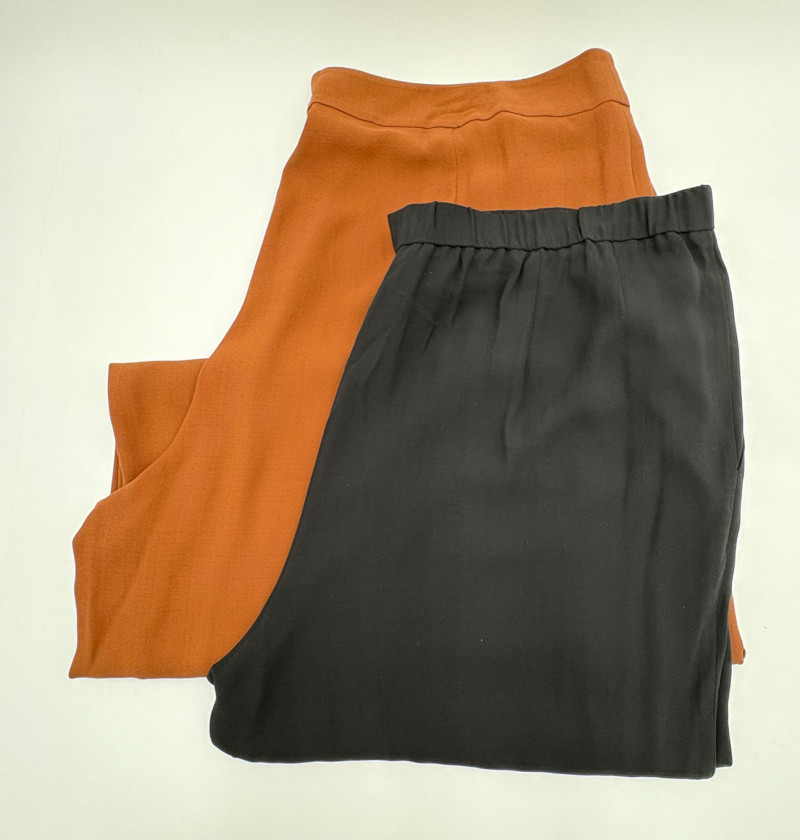 Two pairs of incredibly gorgeous 100% silk pants from Eileen Fisher. Both are in excellent condition. Brown pair has front pleats, set-in side pockets, wide fitted waistband, back waistline darts, and invisible side zip closure with wide legs (measure 18" wide!). Measure 20" side to side at waist with 24" inseam. Size tag says 18. Black pants have elasticated waistband, set-in side front pockets, back waist line darts, and tapered leg. Measure 20" side to side at waist with 28.5" inseam. Size tag says XL. NOTE: as larger gals, we hate when people display pants in our size with the waistband folded back to make them look smaller - it doesn't give the true shape/size of the pants. Thus, the photos of both of these pairs of pants hanging up aren't ideal. However, since they are silk, the whole beauty of the pants is the flowing "hang" which is lost when laid flat. In order to get the photo with the correct "hang" we folded the waistbands - mea culpa, but now you can see how beautiful they are!