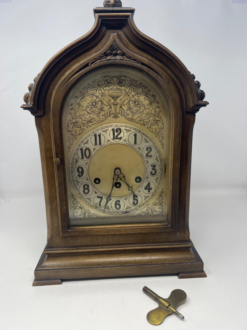 A beautifully crafted vintage mantel clock by Herschede Hall Clock Co., Cincinnati, USA. This Westminster chime clock features a classic wood encasement with an ornate silvered dial, Roman numerals, and elegant black hands. The clock offers both Westminster and Canterbury chime options. Maker: Herschede Hall Clock Co., Cincinnati, Ohio, USA Model: 10, Lever Westminster Mantel Chime Clock Chime Options: Westminster and Canterbury Movement: 11-Jewel, patented Jan. 28, 1919 and Oct. 21, 1919 Serial Number: 60537 Features: Ornate silver-tone dial with floral engraving Original Herschede winding key included Internal instructions label still attached Brass movement with visible chime rods and hammer mechanism Note: The clock will need servicing to be fully operational