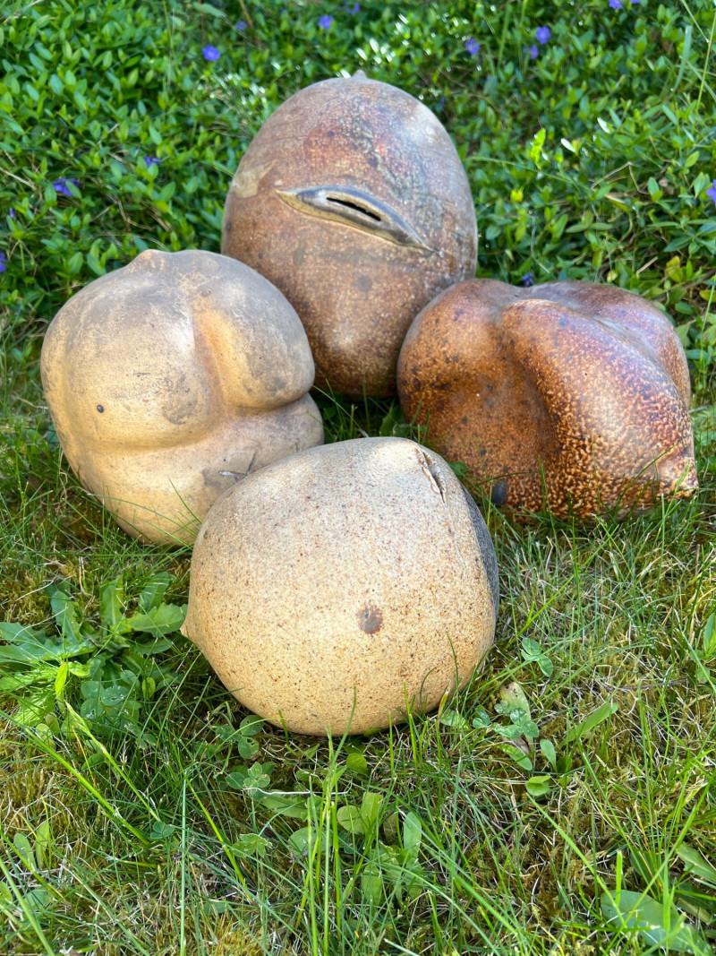 Add a whimsical and earthy touch to your outdoor space with this unique collection of garden artisan pottery art. A handcrafted sculpture features an organic, abstract form with rich natural textures and earthy tones, blending beautifully into a garden or green setting. The sculptural forms resemble pod-like or humanoid shapes with expressive, stylized features. Made from high-fired stoneware, these pieces are weather-resistant and perfect for outdoor display year-round. Each sculpture is individually signed with an artist’s mark on the base. This is a one-of-a-kind set ideal for collectors of artisan ceramics, garden decorators, or anyone who appreciates bold and imaginative handmade art. Quantity: 4 ceramic sculptures Material: Stoneware clay Origin: Artisan handmade