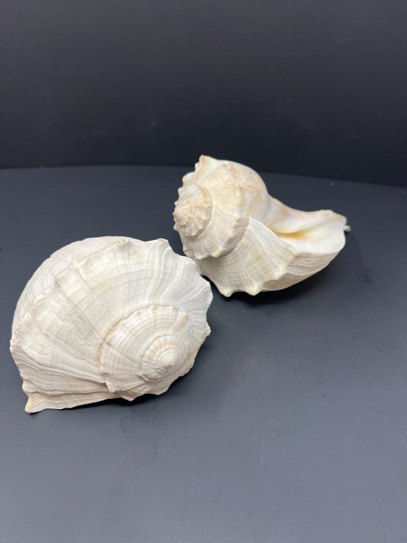 Left Handed Lightning Whelk Busycon Contrarium This listing features a beautiful pair of natural sea shells with a creamy white color and intricate spiral ridges. These shells showcase organic texture and subtle natural patterns, making them perfect for coastal decor, crafting, or display. Each shell has a distinct form with gently curved edges and a smooth inter ior. Quantity: 2 shells Color: Off-white / Light beige