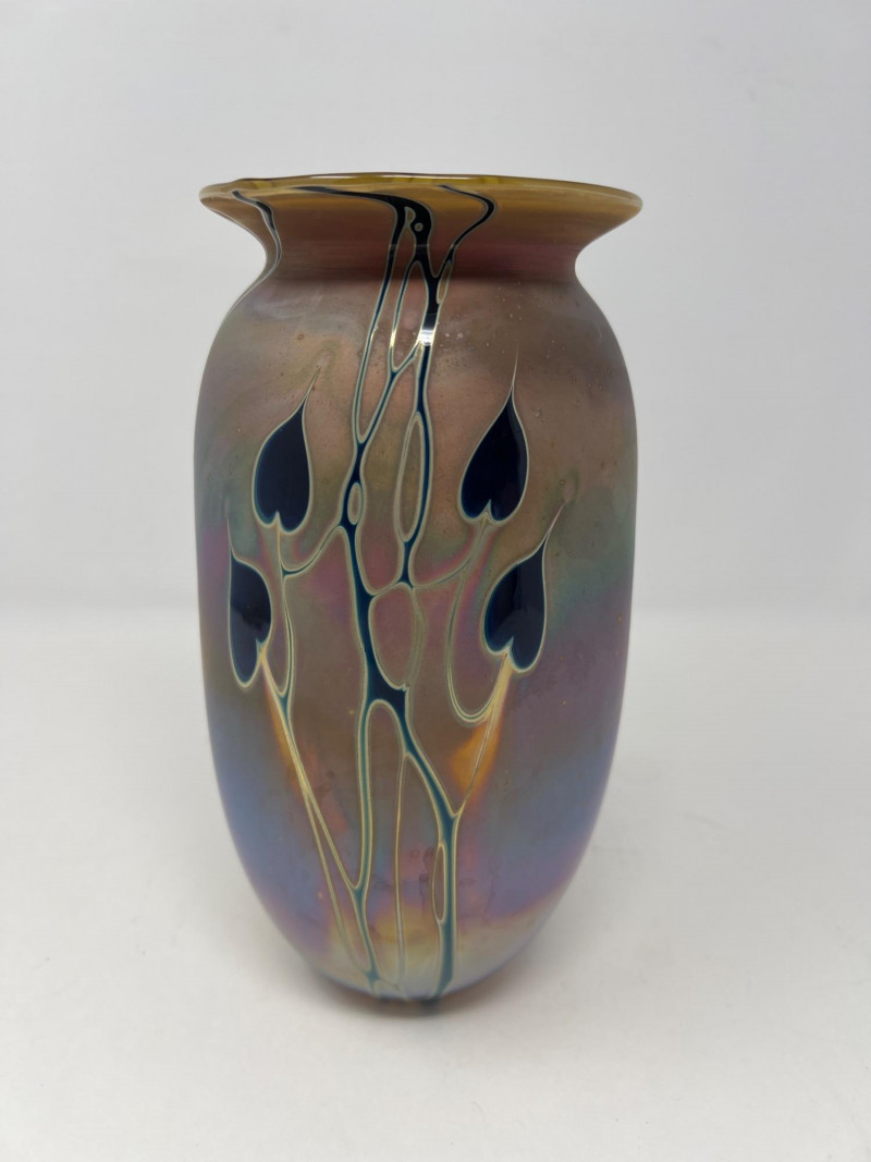This exquisite handblown art glass vase by renowned American glass artist Craig Zweifel features a mesmerizing iridescent surface with flowing feathered leaf designs in deep cobalt and cream. The piece showcases Zweifel’s signature organic motifs and expert use of color, blending purples, golds, and blues for a stunning, luminous effect that changes with the light. Artist: Craig Zweifel Medium: Handblown iridescent art glass Design: Organic abstract motifs in cobalt and ivory Color palette: Iridescent tones of purple, gold, green, and blue Signature: Signed “Zweifel” and dated 8/81 – 12 on the base