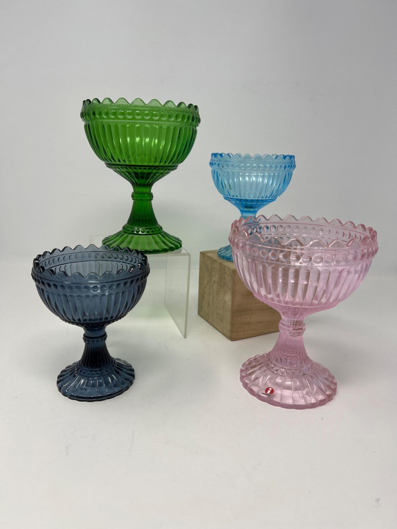 A beautiful set of four pedestal glass bowls by Iittala in collaboration with Marimekko, known as "Mariskooli." These iconic Finnish bowls feature scalloped rims, fluted bodies, and vibrant pressed glass in assorted colors: pink, green, blue, and smoky gray. Set Includes: Two bowls, 6” H x 4.75” diameter Two bowls, 5” H x 3.75” diameter Each is etched with the marimekko mark and retains the original Iittala label. Made in Finland. A classic blend of Scandinavian design and functional elegance