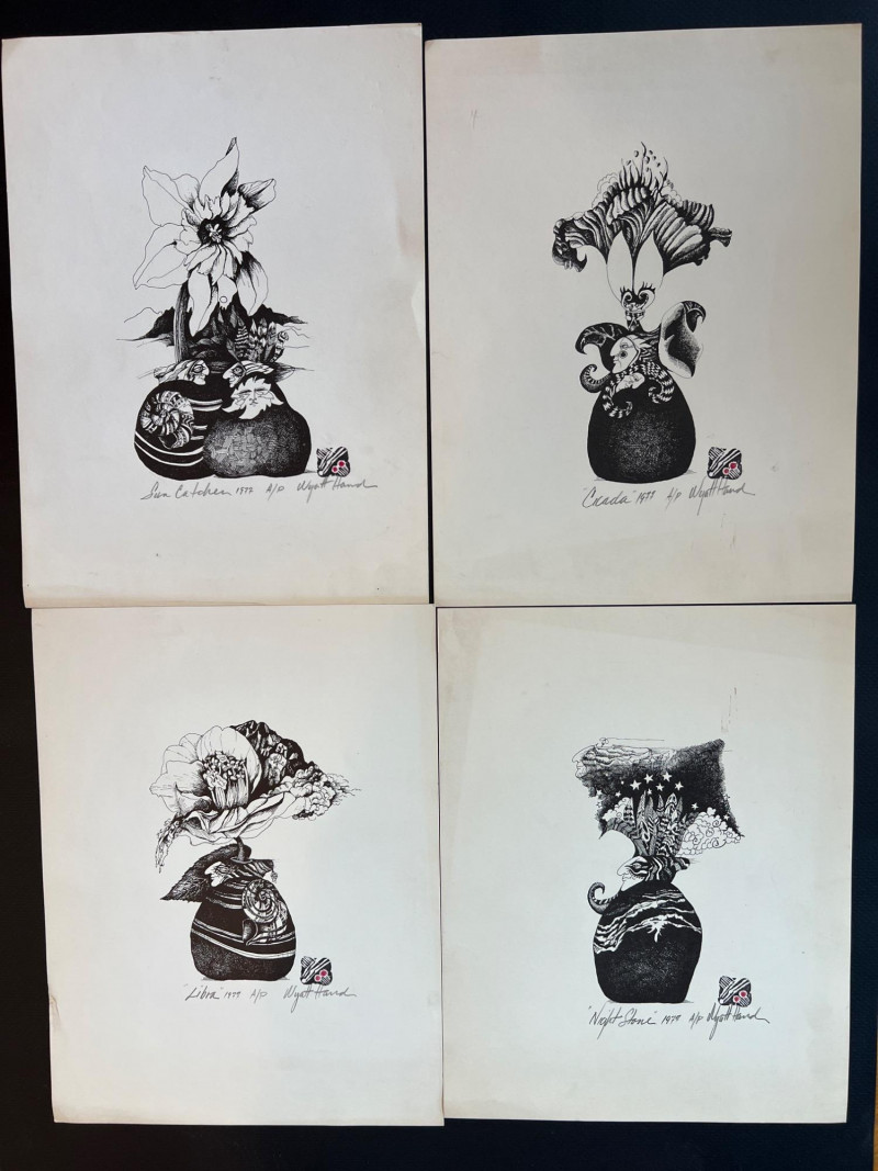 Four Artist Proof’s signed in pencil by Wyatt Hand and dated 1977. Black and white prints on heavier paper stock. Entitled: “Night Stone”, “Libra”, “Cicada”, and “ Sun Catcher”.