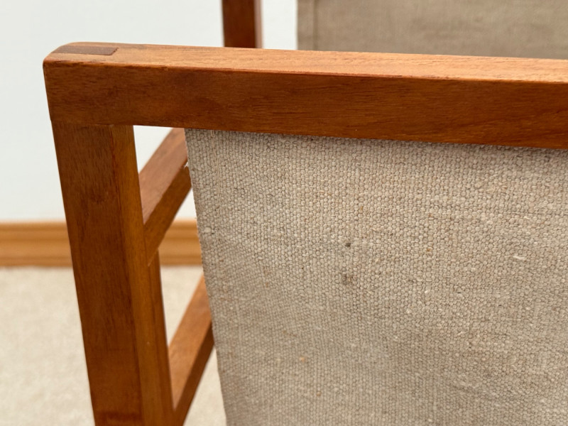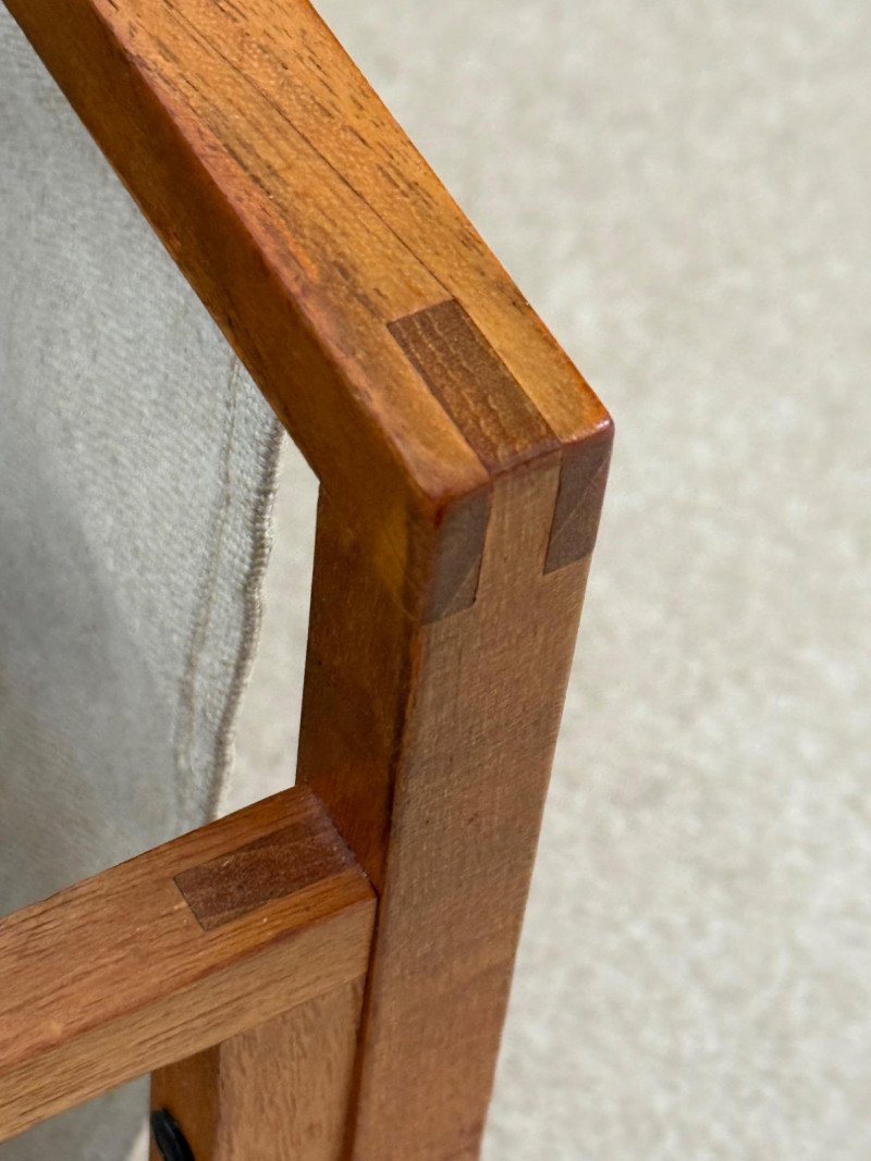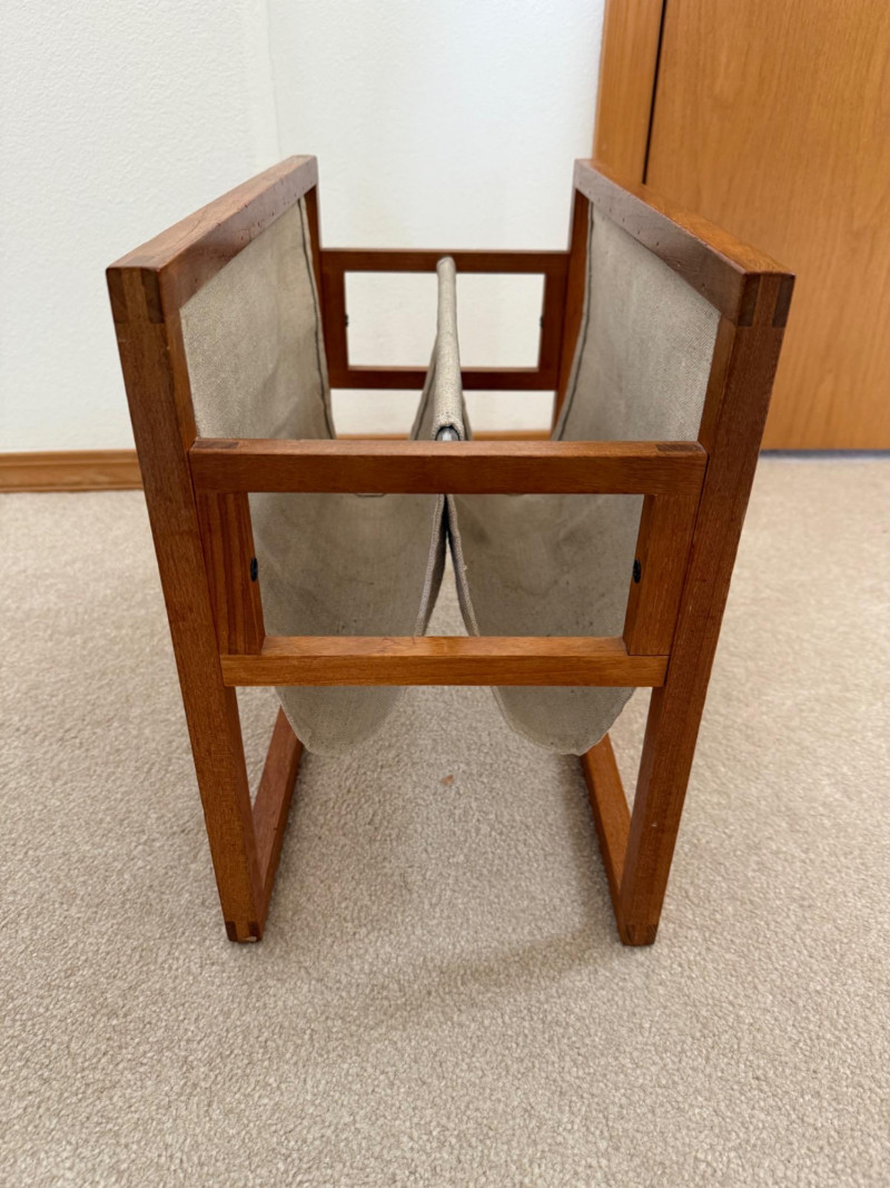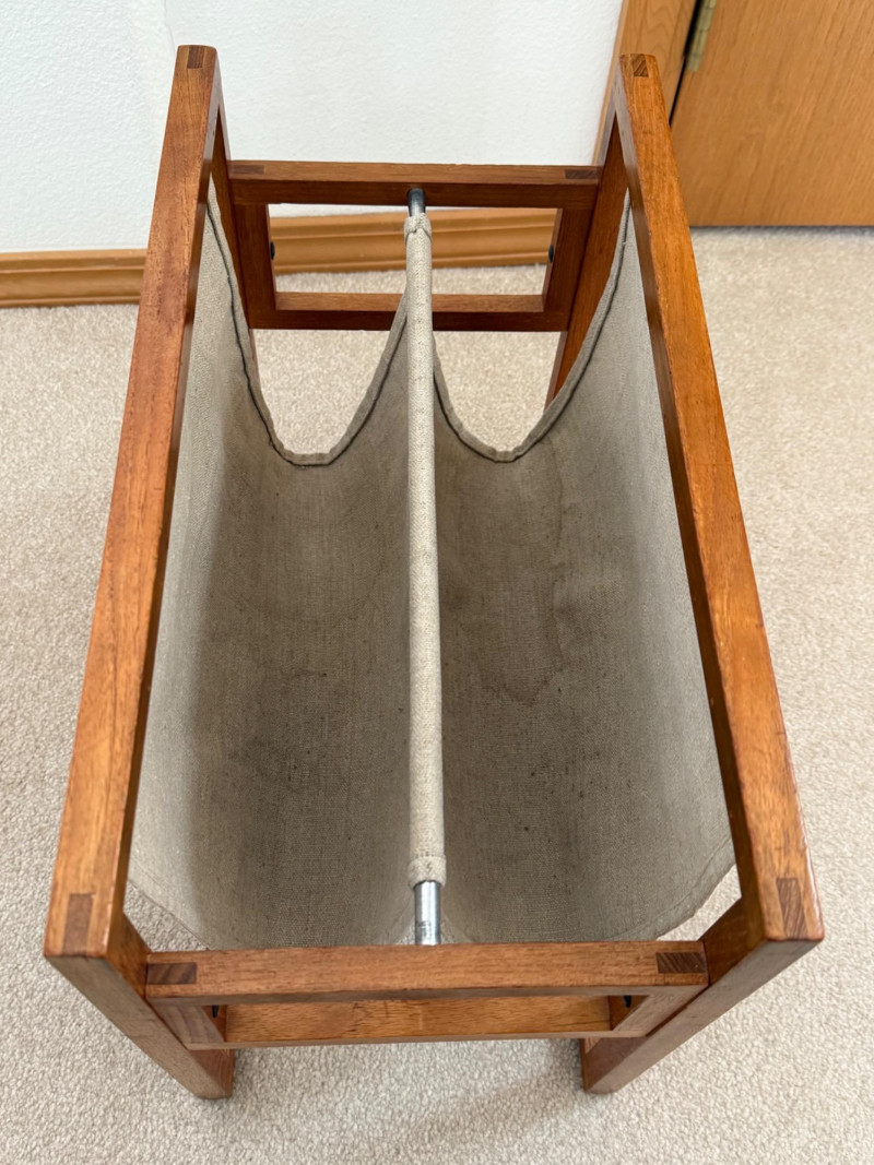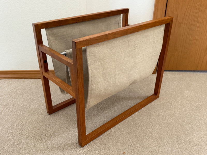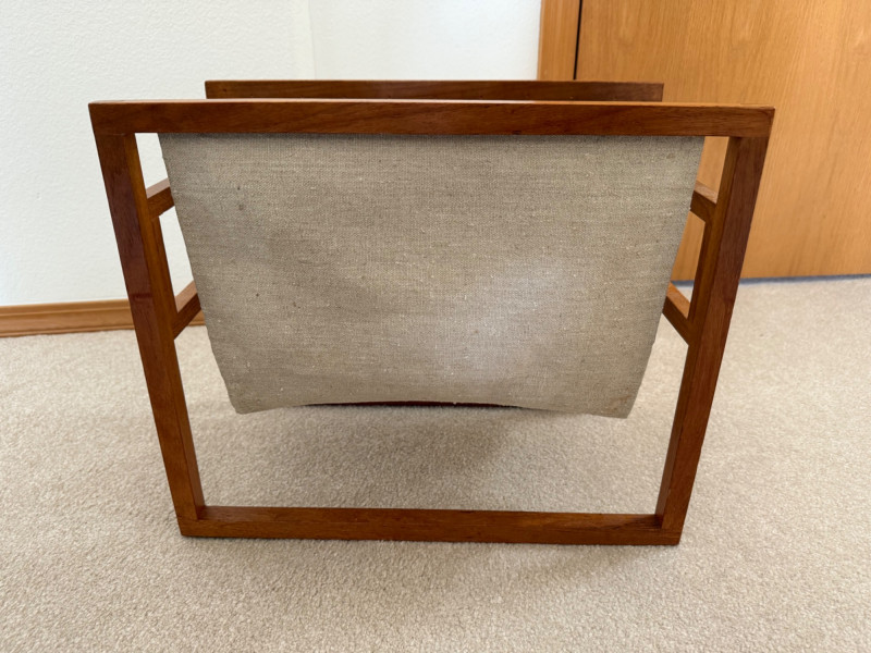 Stylish Mid-Century Modern magazine rack crafted from solid teak with a canvas sling-style holder. Made in Denmark, this piece combines elegant simplicity with practical design, offering a warm teak frame and neutral fabric insert for organizing magazines, records, or newspapers. Compact yet sculptural, it fits beautifully in living rooms, offices, or reading nooks with Scandinavian or modernist decor. Dimensions: 18” W x 15” H x 9.75” D In excellent vintage condition with clean fabric and a sturdy frame. A refined storage solution with iconic Danish style. Bidding on this lot is an agreement that: (1.) You will have at least 2 capable, able-bodied persons to lift and load at a minimum. (2.) You will bring a hand truck and/or any other tools needed to remove this item. If these steps are not followed your item will be forfeited and no refund given.