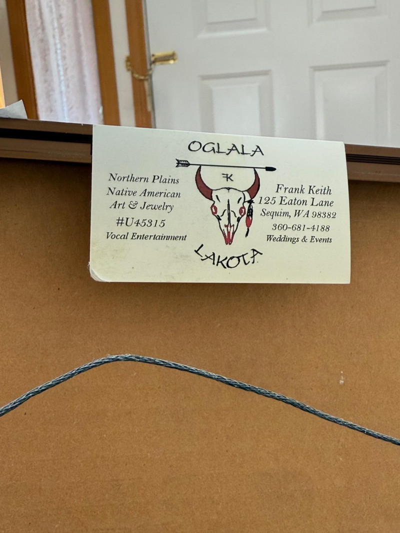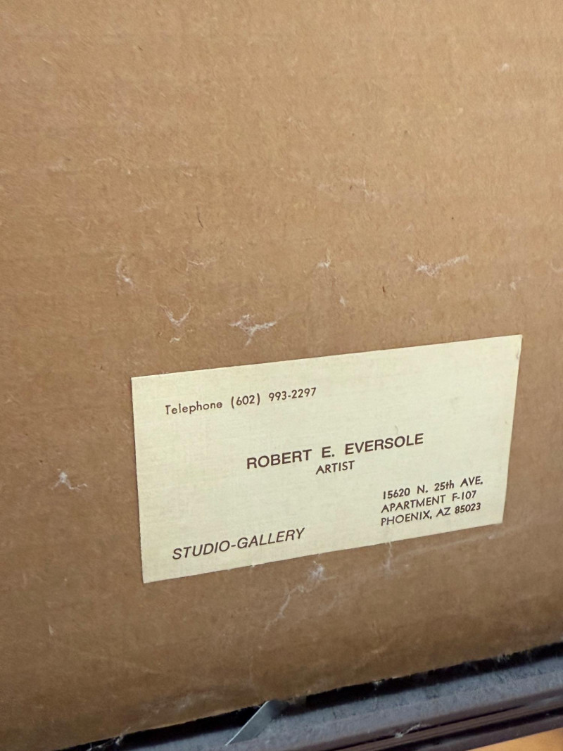 Striking original watercolor painting by artist Robert E. Eversole, signed and dated 1980 in the lower right. This expressive portrait captures a Native American subject with rich tones of rust, ochre, and deep brown, enhanced by intricate detailing and a focused gaze. The painting is professionally matted and framed under glass, with labels on the back from both the artist’s Studio-Gallery in Phoenix, AZ and Frank Keith of Oglala Lakota Northern Plains Art & Jewelry, suggesting additional provenance. Artist Info: Robert E. Eversole, Studio-Gallery, Phoenix, Arizona Signed and dated: Eversole '80 Medium: Watercolor on paper Framed Dimensions: 16.5" W x 20.5" H Condition: A powerful and culturally resonant work for collectors of Southwestern art, Native American portraiture, or 20th-century American watercolor.