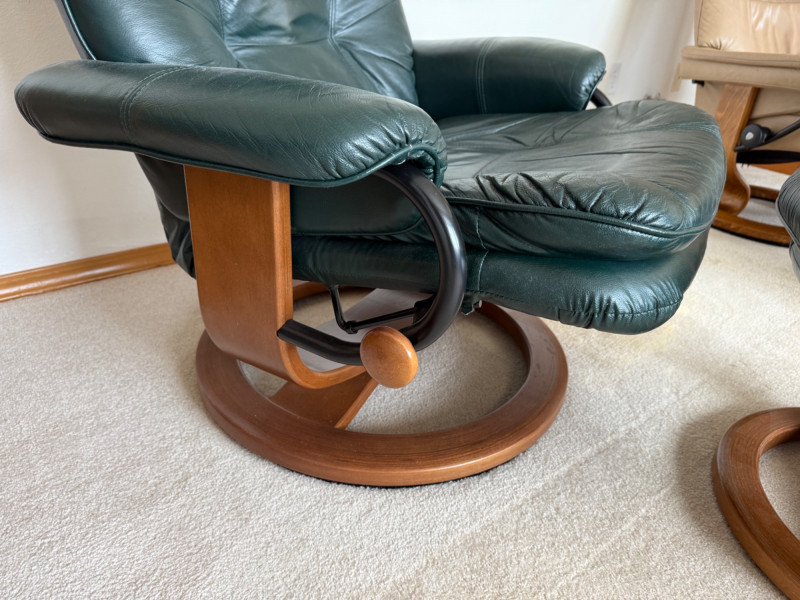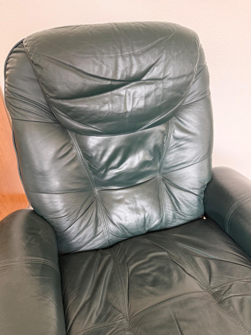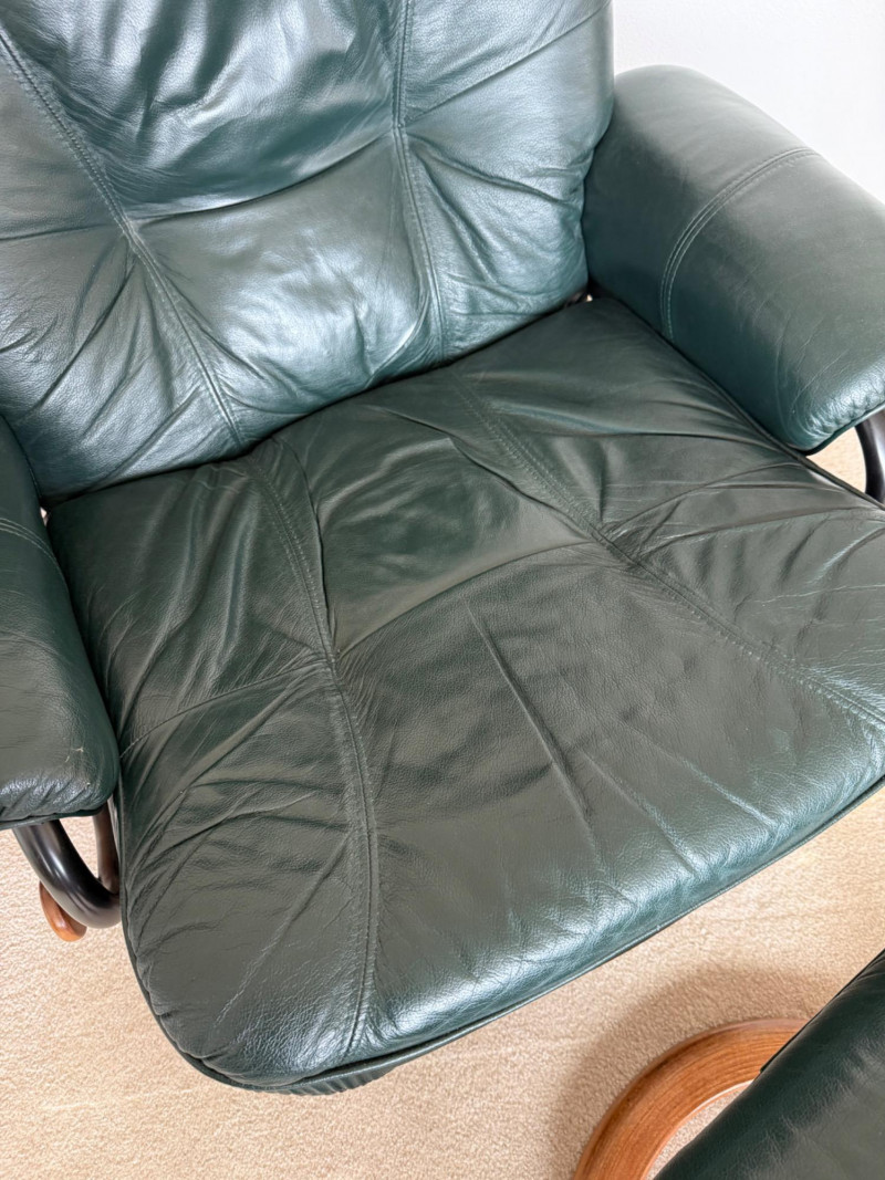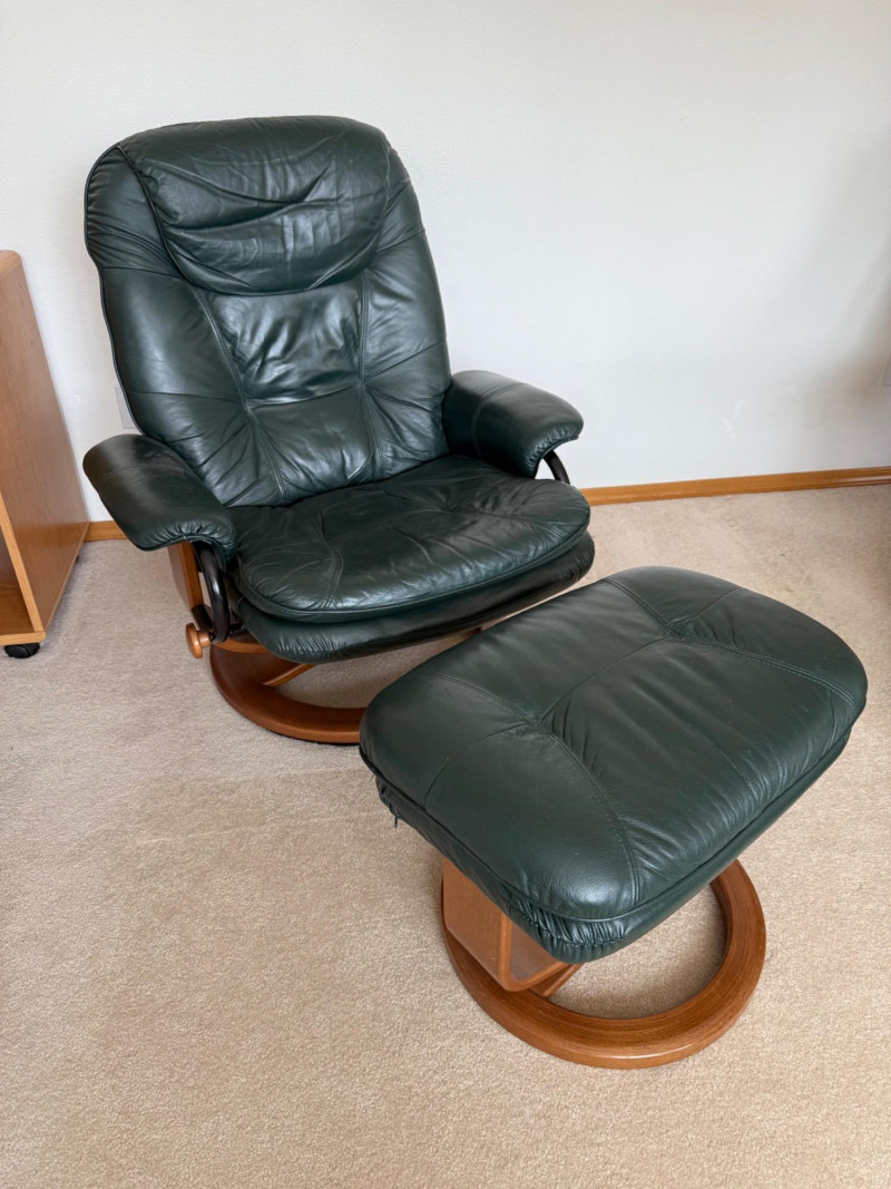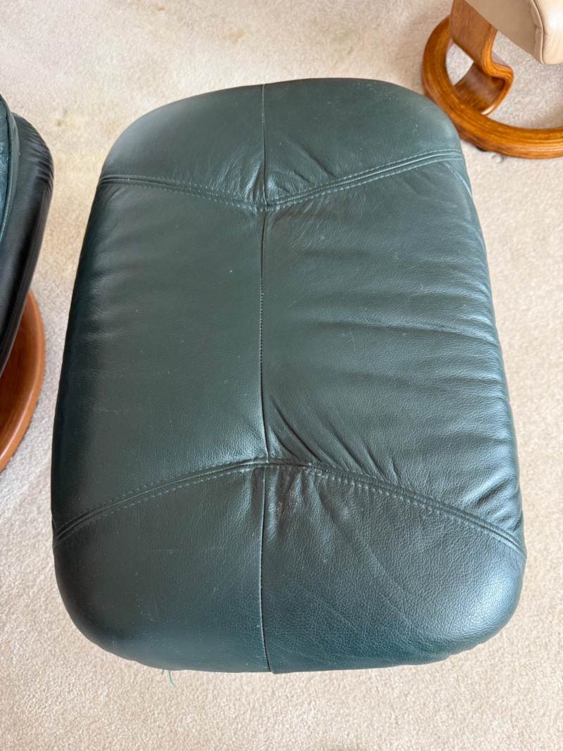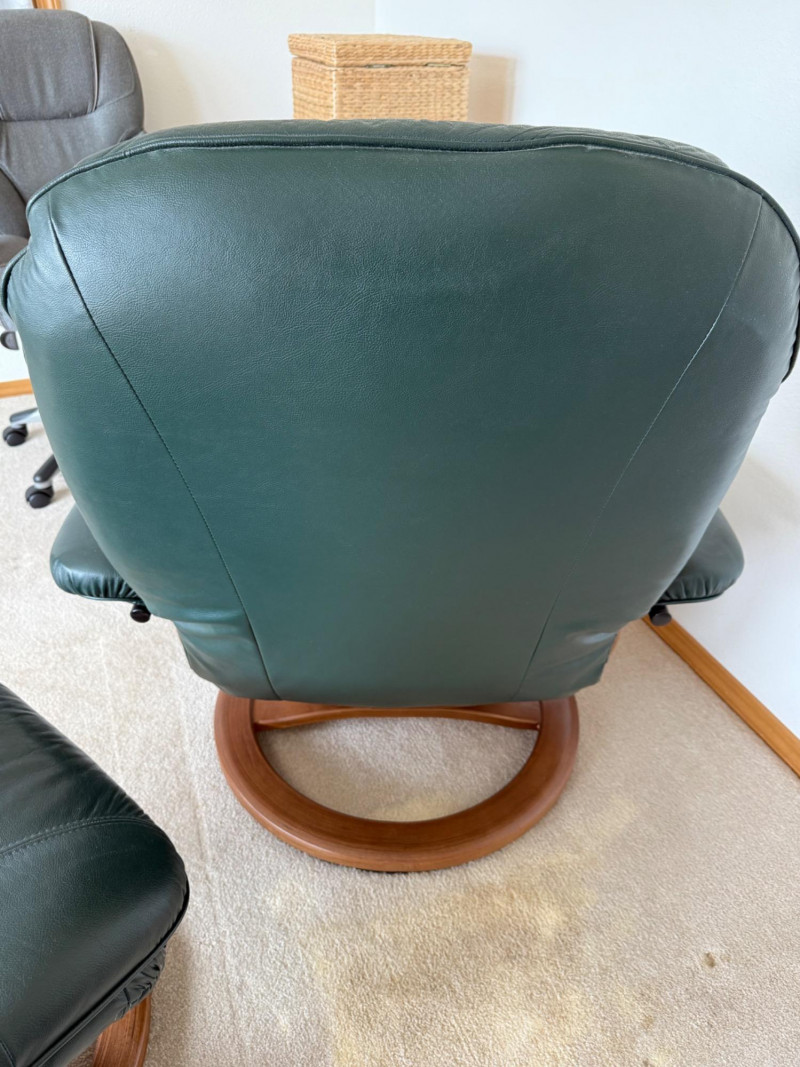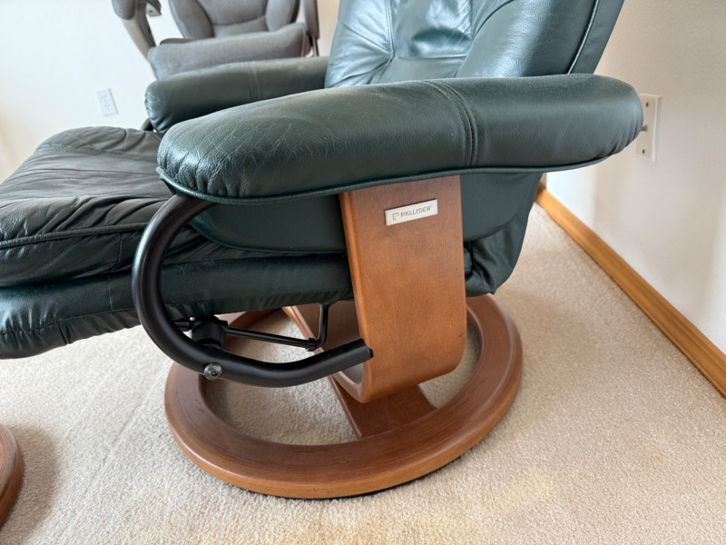Comfort meets quality in this Palliser leather recliner and ottoman set, featuring soft deep green leather upholstery and a sculptural bentwood swivel base. The chair reclines smoothly for relaxation, while the matching ottoman adds extra comfort and support. Both pieces are in very good condition. Palliser is known for durable craftsmanship and ergonomic design, making this set ideal for reading, lounging, or enhancing any modern or transitional space. Chair Dimensions: 34.5" W x 38" H x 27" D Stylish, supportive, and built to last—ready to enjoy in your home or office.