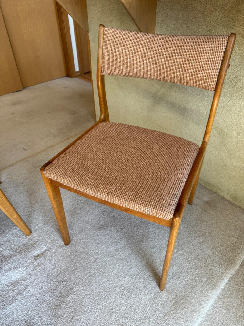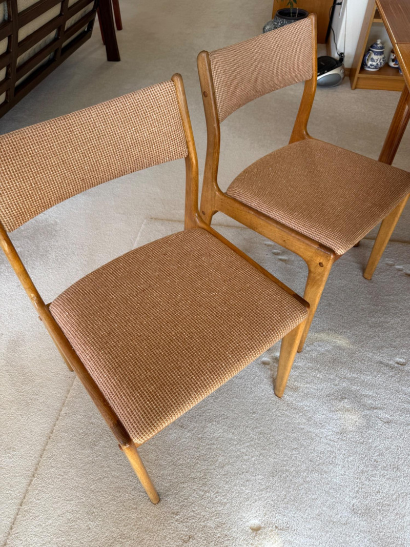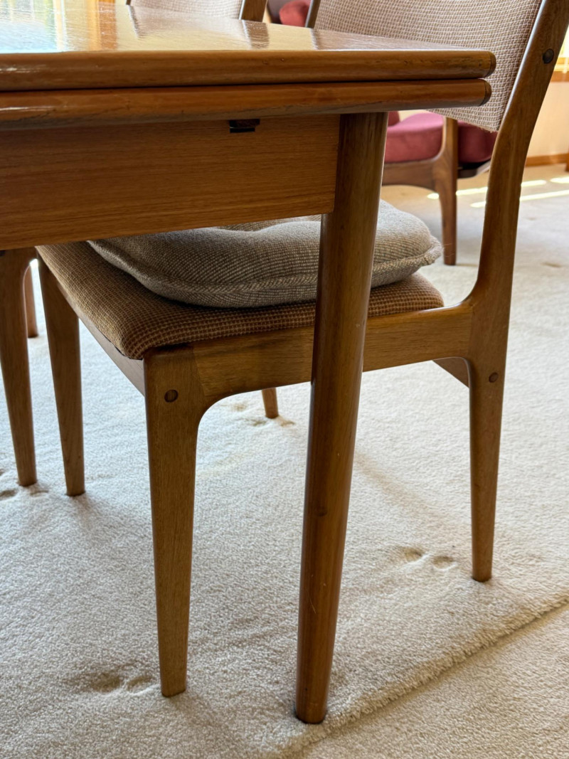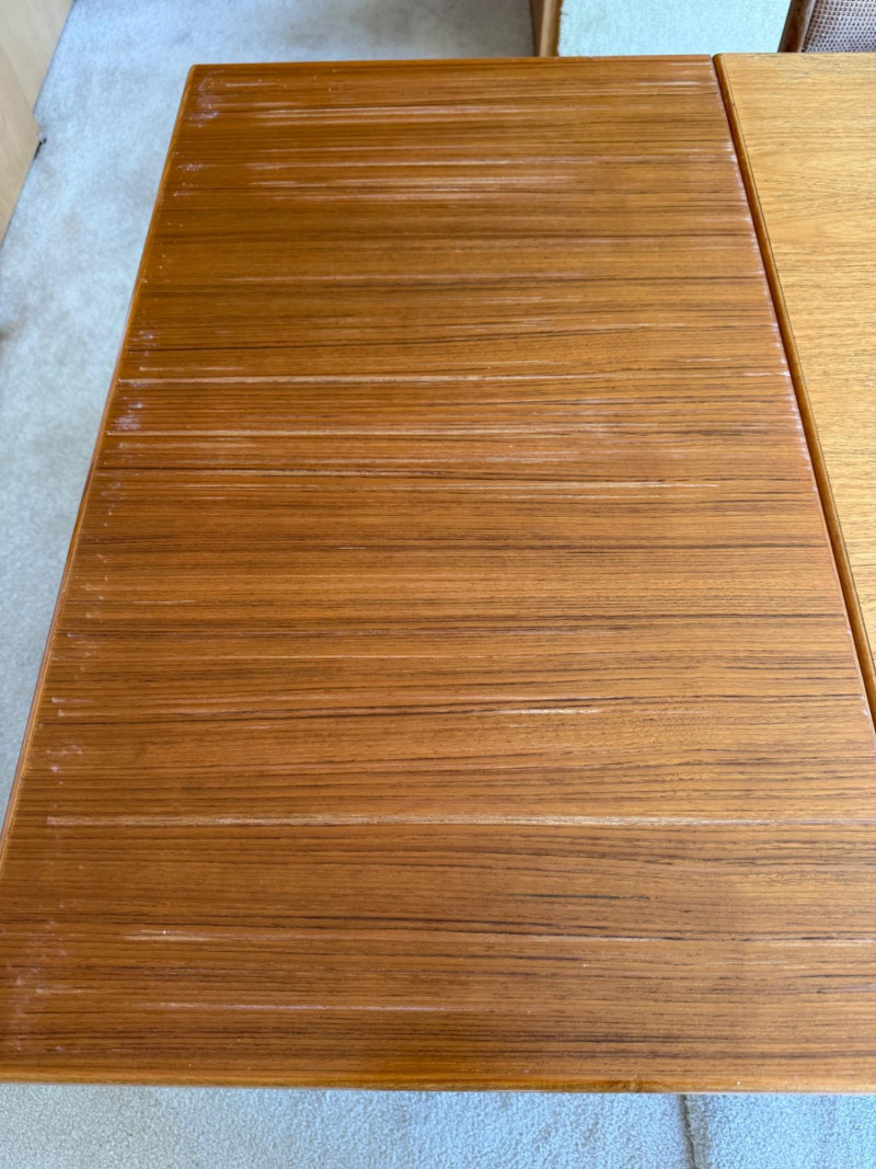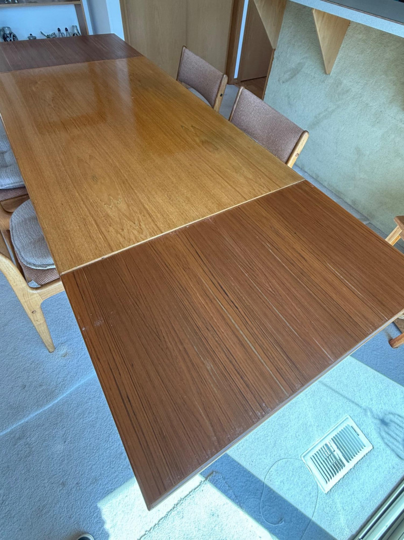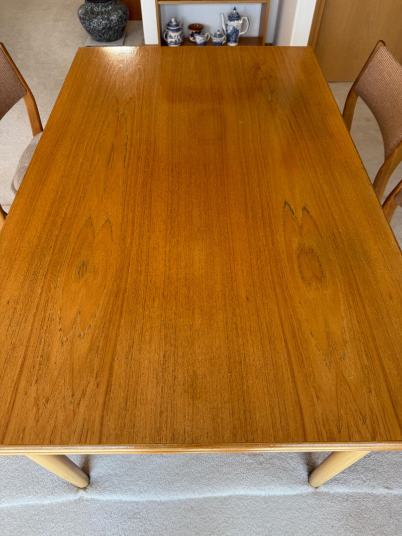 Danish Teak Dining Table & 4 Chairs – Extends to 92” Beautiful Mid-Century Danish teak dining set featuring a sleek rectangular table with integrated extension leaves and four sculpted chairs in classic tan upholstery. Table measures 52.5” wide x 33” deep x 28” high, extending to 92” fully open. Chairs offer a comfortable, timeless profile with ergonomic curved backs. Some sun fading to tabletop and minor wear to seats consistent with age. Clean, elegant lines perfect for modern or retro interiors.