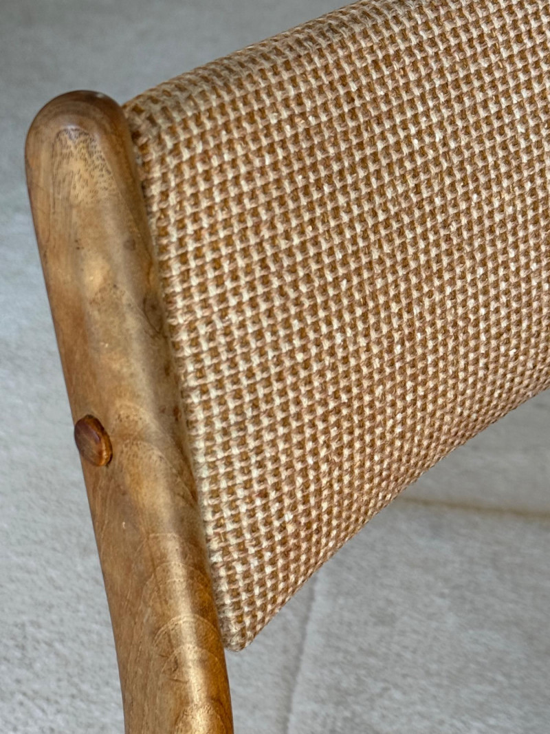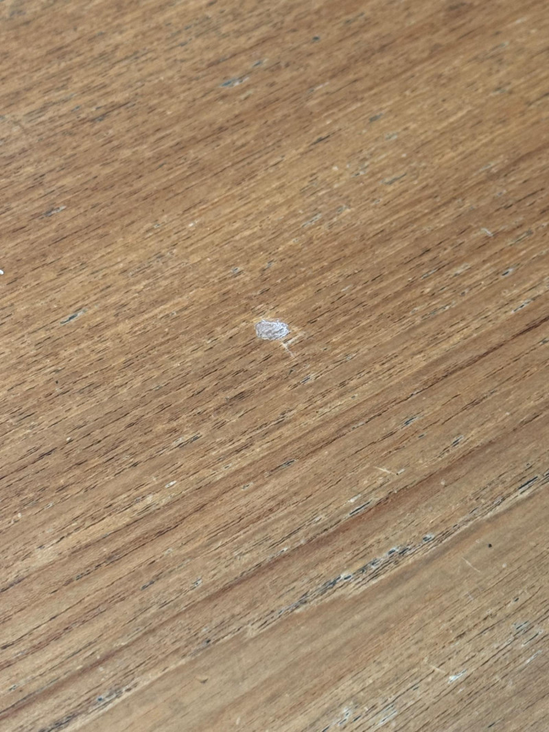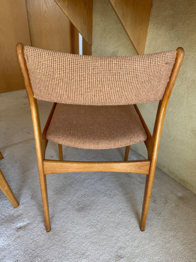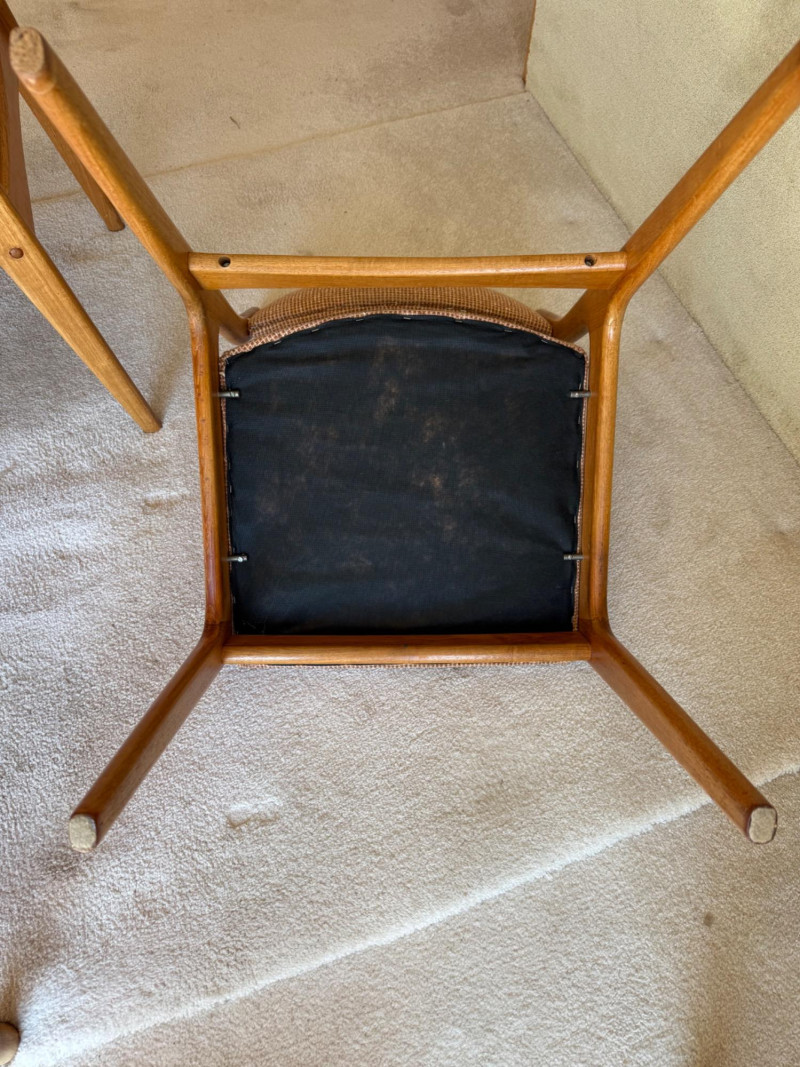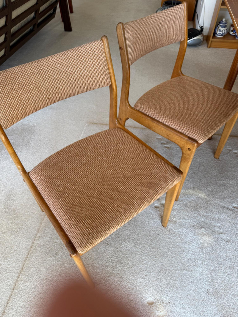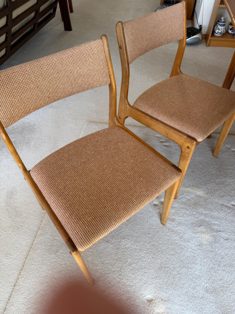 Danish Teak Dining Table & 4 Chairs – Extends to 92” Beautiful Mid-Century Danish teak dining set featuring a sleek rectangular table with integrated extension leaves and four sculpted chairs in classic tan upholstery. Table measures 52.5” wide x 33” deep x 28” high, extending to 92” fully open. Chairs offer a comfortable, timeless profile with ergonomic curved backs. Some sun fading to tabletop and minor wear to seats consistent with age. Clean, elegant lines perfect for modern or retro interiors.