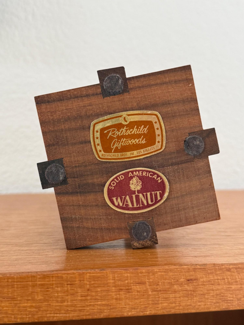Striking Mid-Century Modern vase by Rothschild Originals, featuring a clear cylindrical glass insert supported by a sculptural American walnut frame. Labeled “Solid American Walnut” and “Rothschild Gifts.” Measures approx. 7.5” tall. A perfect minimalist accent for a credenza or shelf, combining clean lines with warm wood tones. Excellent vintage condition.
