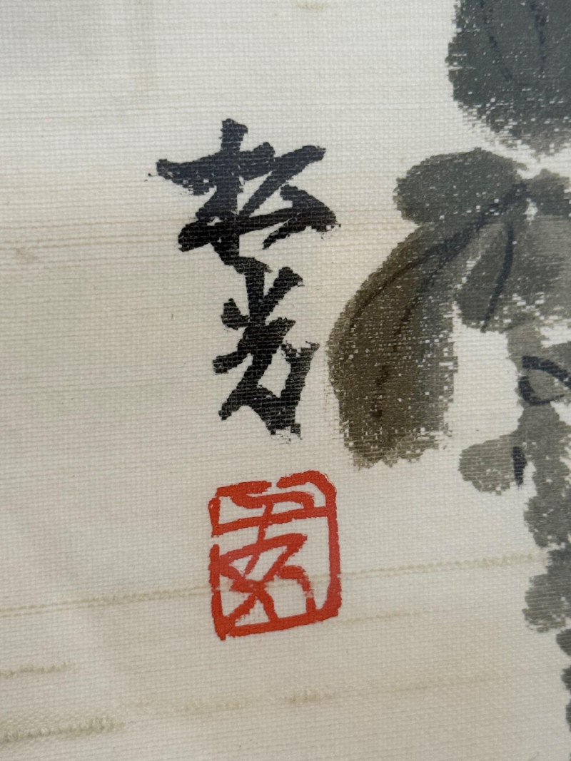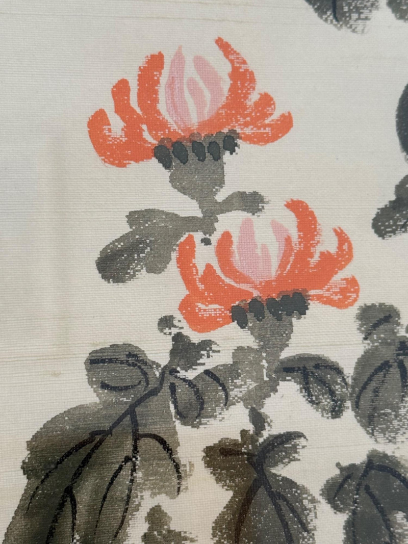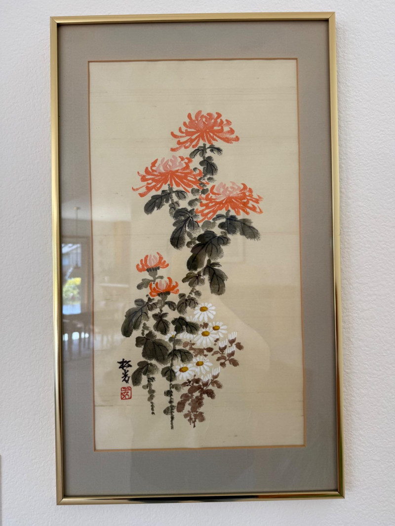 Original Asian Floral Painting on Silk – Signed, Framed 14x24 Delicate and elegant original painting on silk featuring blooming chrysanthemums and daisies in a traditional Asian brushwork style. The piece is signed with artist’s characters and red seal, professionally framed behind glass with a soft gray mat and gold-tone frame. Artwork measures 14” W x 24” H including frame. A serene and refined piece that adds timeless beauty to any space.