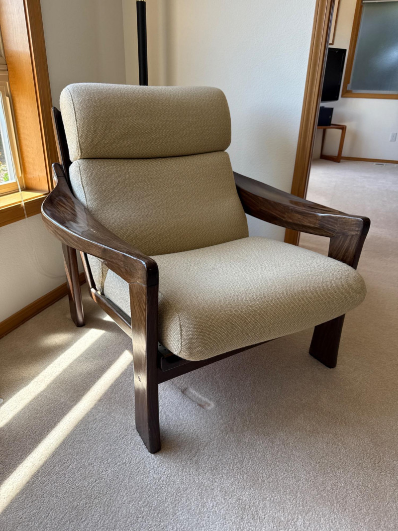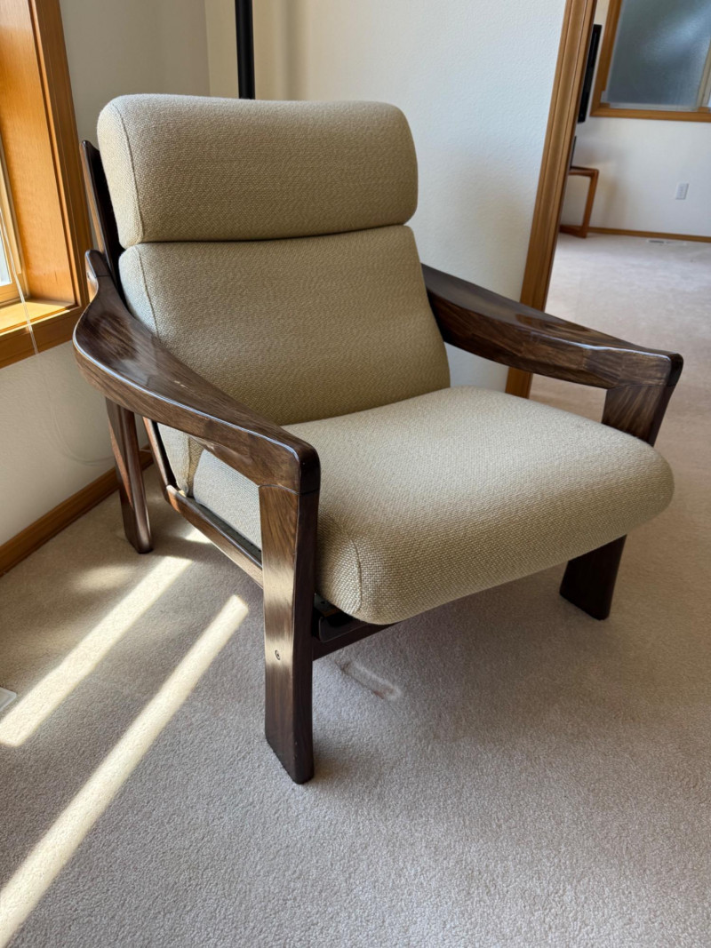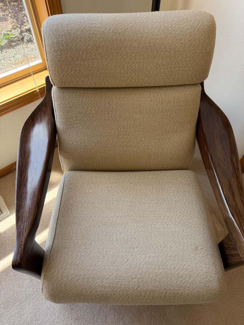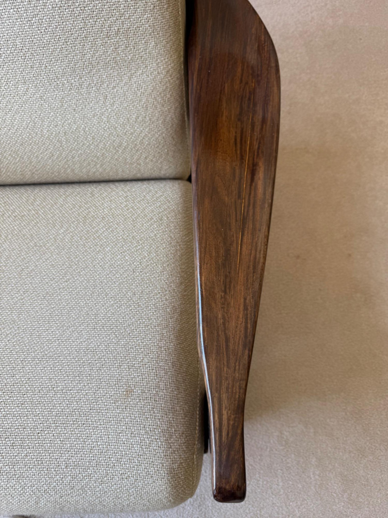 Mid-Century Modern Lounge Chair – Sculpted Arms, 33.5” Wide Handsome Mid-Century Modern lounge chair featuring sculpted wood arms, a slatted back, and wide, comfortable proportions. Chair measures 33.5” W x 34” H x 31” D. Neutral upholstery appears clean and well-fitted; wood frame is in very good vintage condition with only minor wear. An elegant piece that combines form and function—ideal for modernist interiors or reading nooks.
