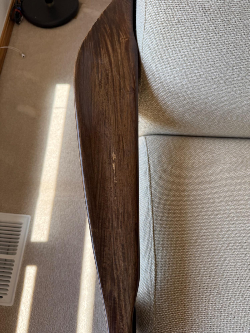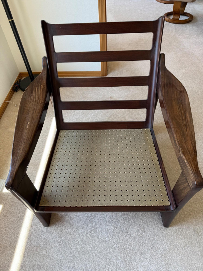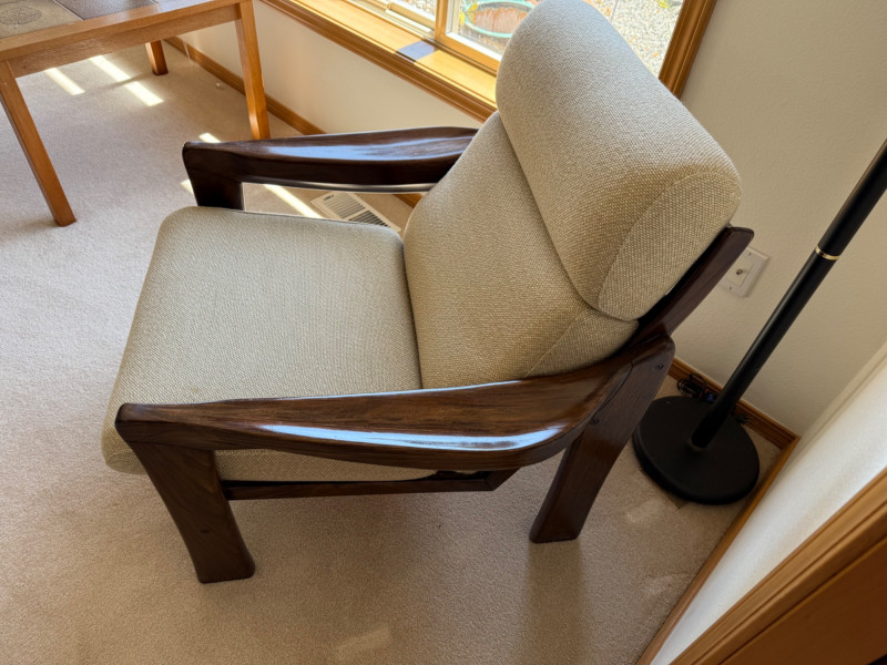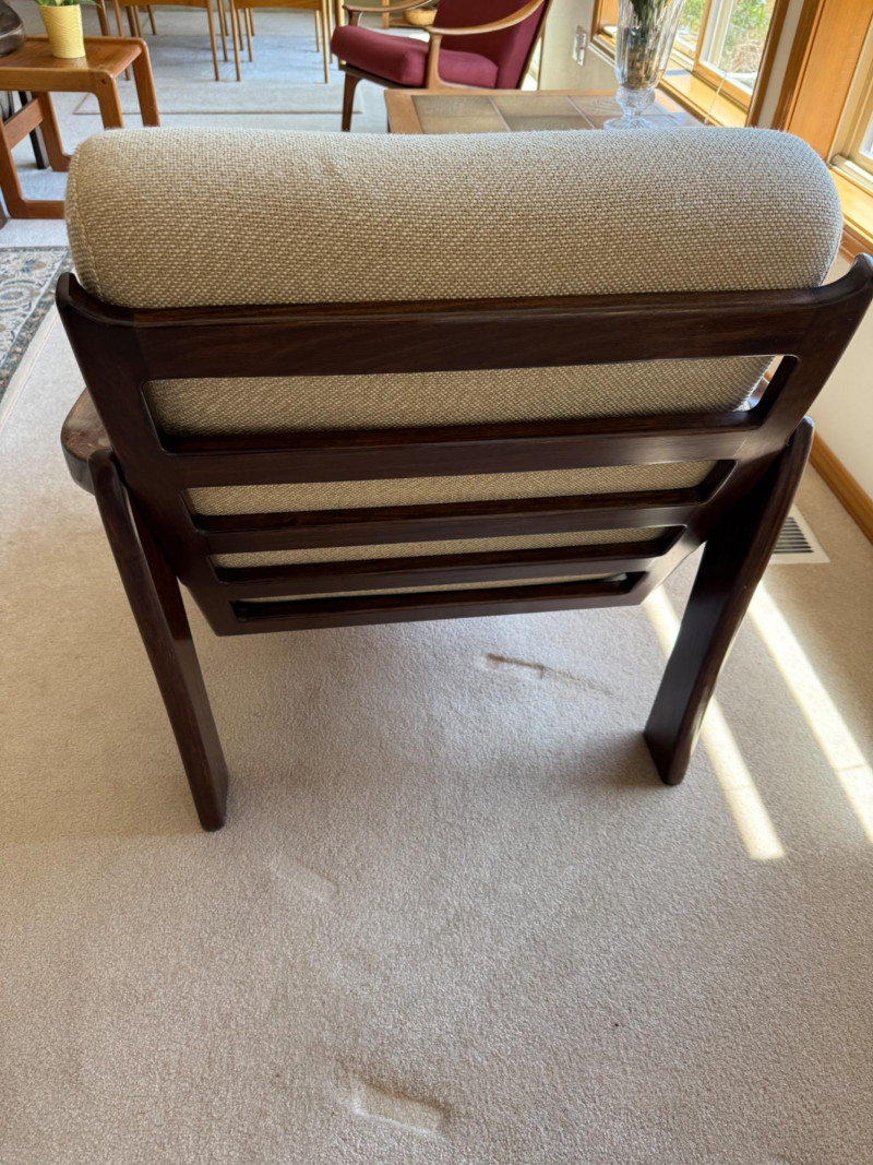 Mid-Century Modern Lounge Chair – Sculpted Arms, 33.5” Wide Handsome Mid-Century Modern lounge chair featuring sculpted wood arms, a slatted back, and wide, comfortable proportions. Chair measures 33.5” W x 34” H x 31” D. Neutral upholstery appears clean and well-fitted; wood frame is in very good vintage condition with only minor wear. An elegant piece that combines form and function—ideal for modernist interiors or reading nooks.