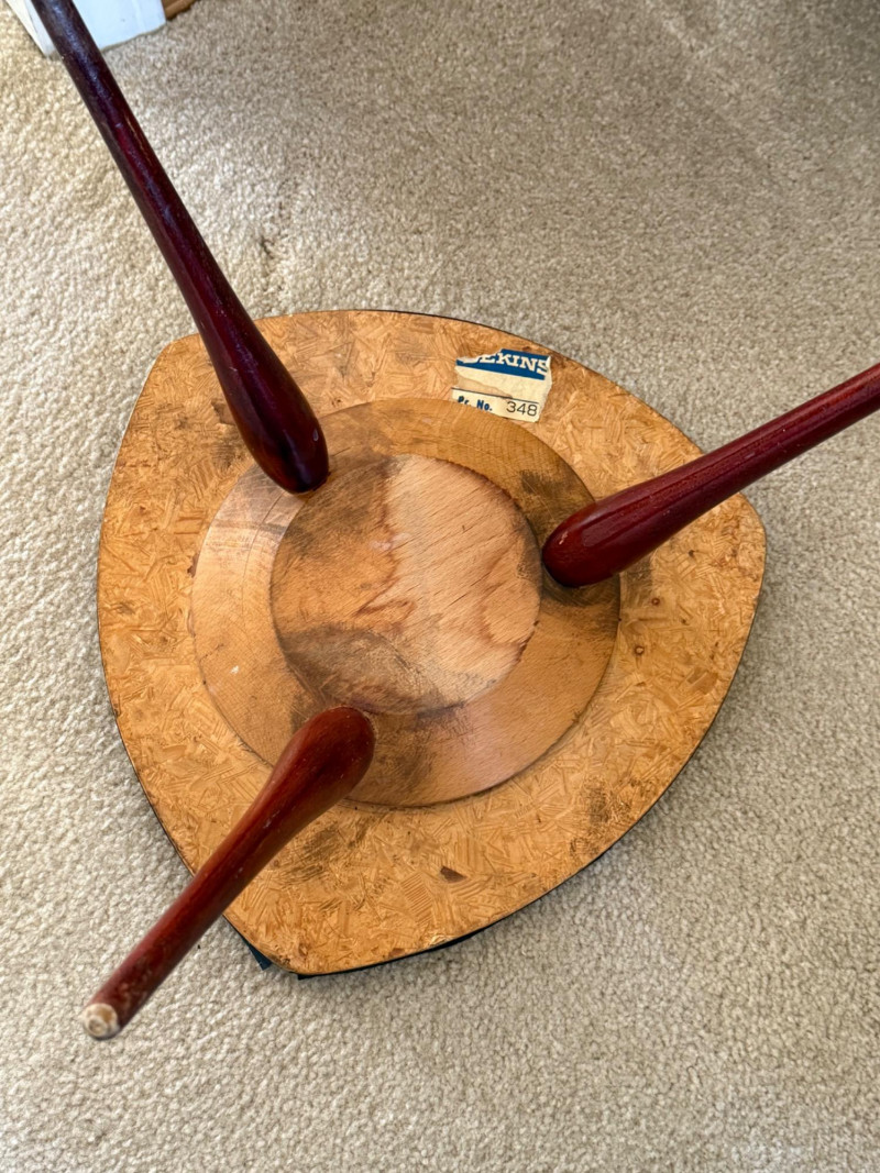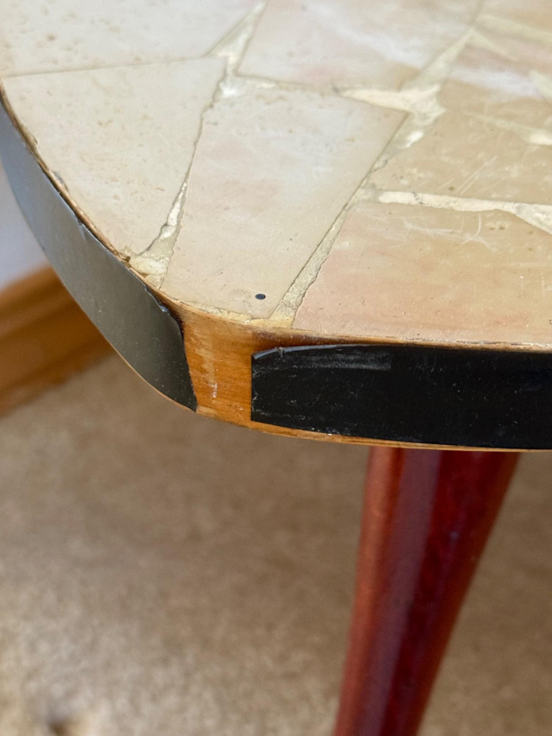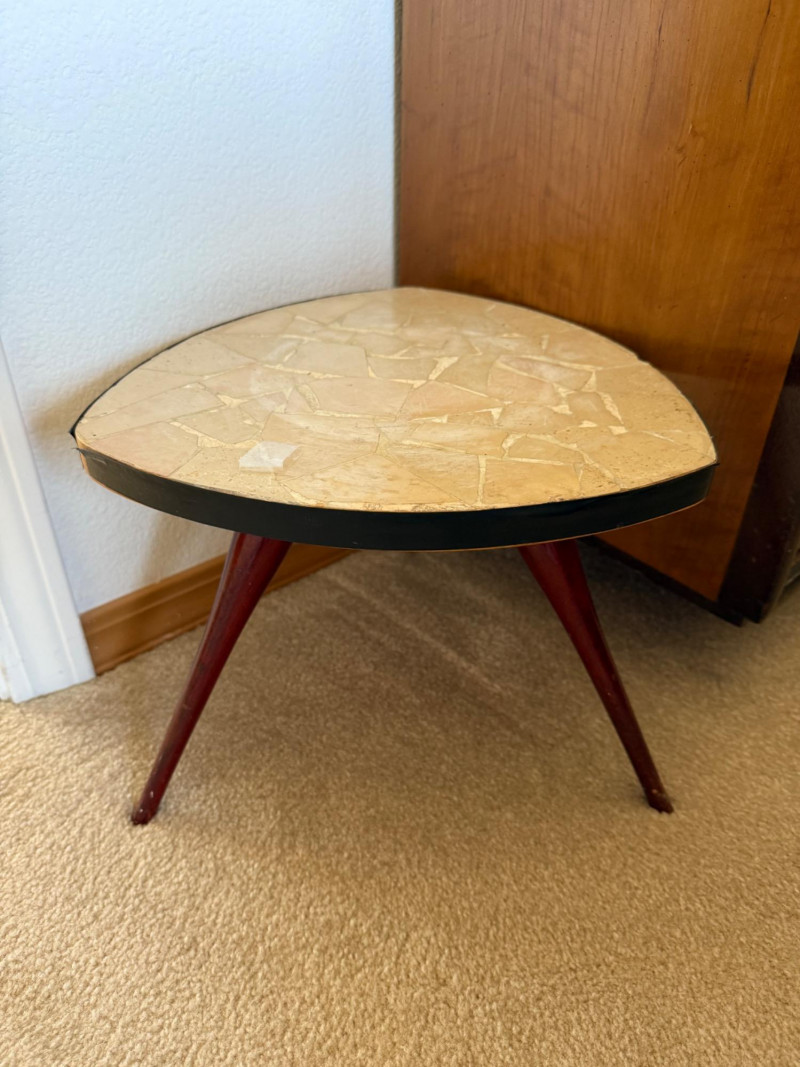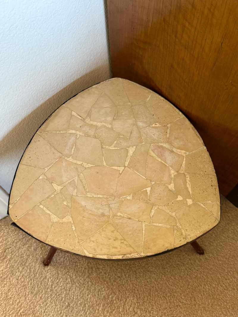 Charming Mid-Century Modern plant stand with a terrazzo-style stone mosaic top in organic tones, set on three tapered wood legs. Compact and sculptural, it measures approx. 12.5” W x 9.5” H. Signs of age include scuffs, scratches, and edge wear—see photos. A retro accent piece, perfect for displaying small plants or curios.