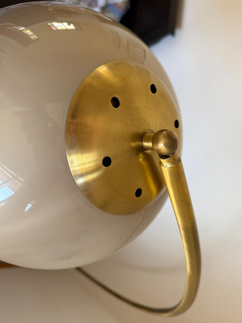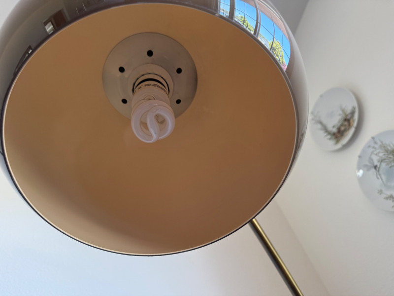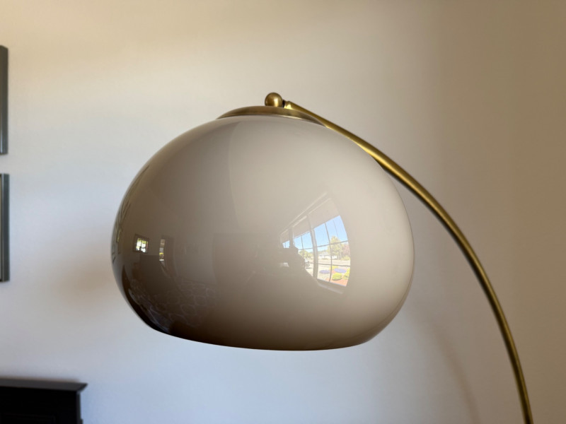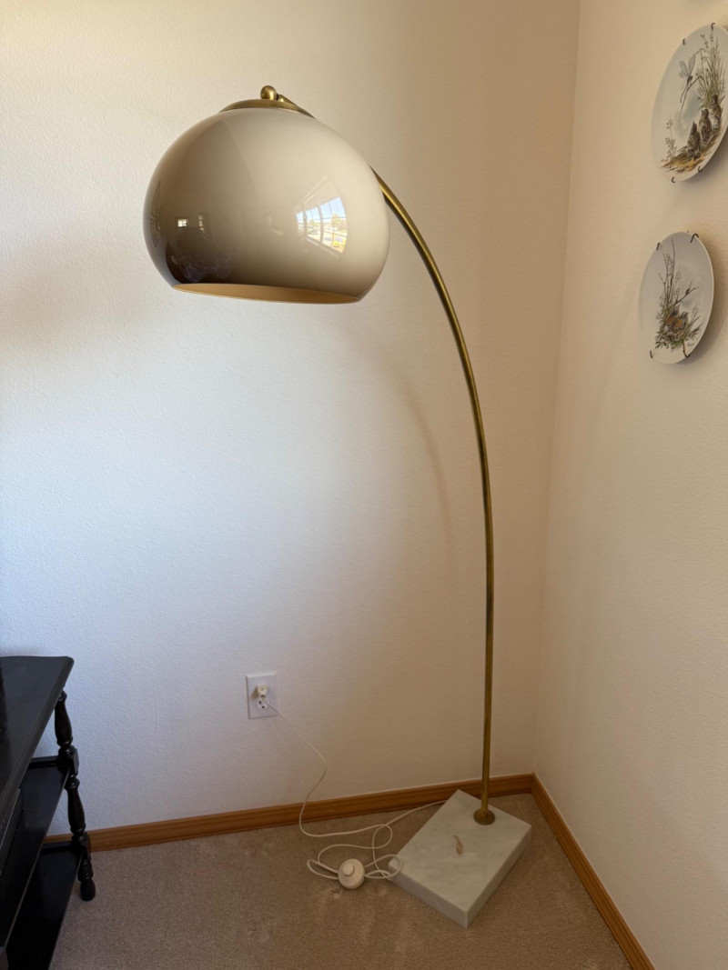 Mid-Century Arc Floor Lamp – Marble Base 58” Tall Sleek MCM-style arc floor lamp with a weighted marble base, brushed brass-tone arched arm, and glossy dome shade. Measures 58” tall with a 10” wide shade. Features an inline floor switch. Great for adding ambient light and sculptural presence to modern interiors.