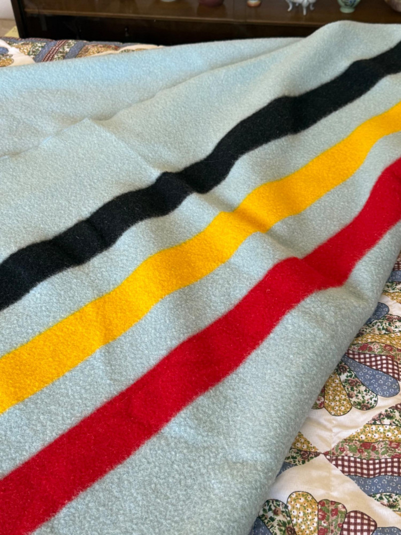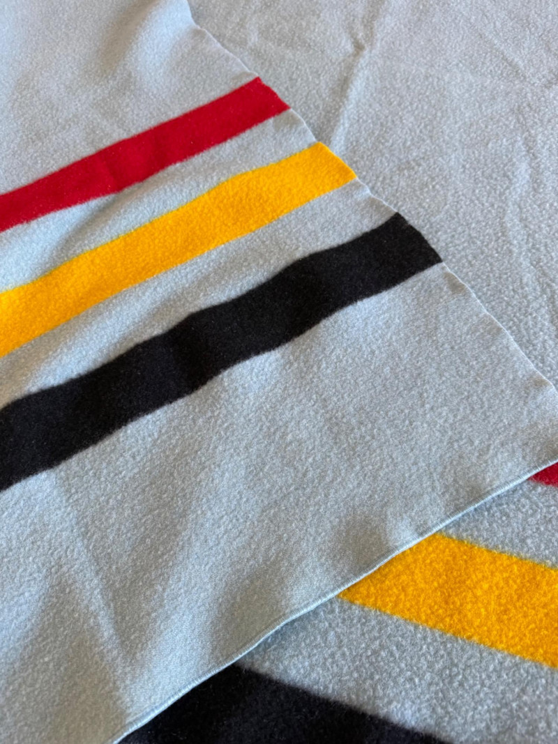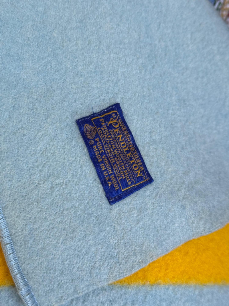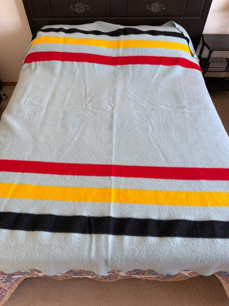 Vintage Pendleton wool blanket in the classic Glacier Park stripe pattern with bold red, yellow, black, and white bands on a light blue base. Measures approx. 80” x 70” and is shown on a full-size bed. Made in the USA from pure virgin wool, with original label intact. No holes or tears—very well preserved with vibrant color and soft texture.