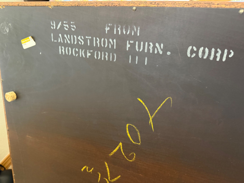 Vintage Cherry Display Credenza by Landstrom Furniture Marked “9/55” by Landstrom Furniture Corp, Rockford, IL, this vintage cherry display credenza features sliding smoked glass doors and an interior shelf for ample storage or display. The sleek, mid-century silhouette is crafted from cherry wood with warm tones and clean lines. Back is factory stenciled. Light surface wear consistent with age.