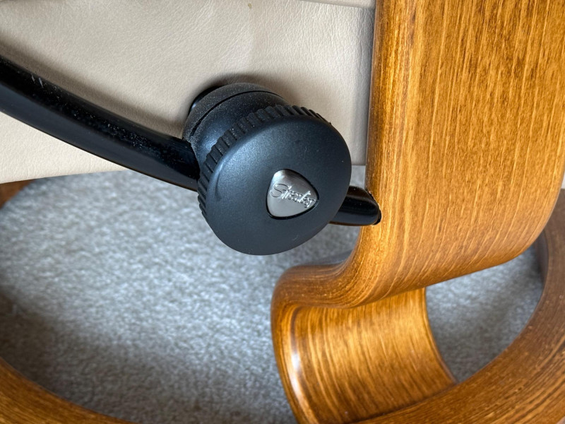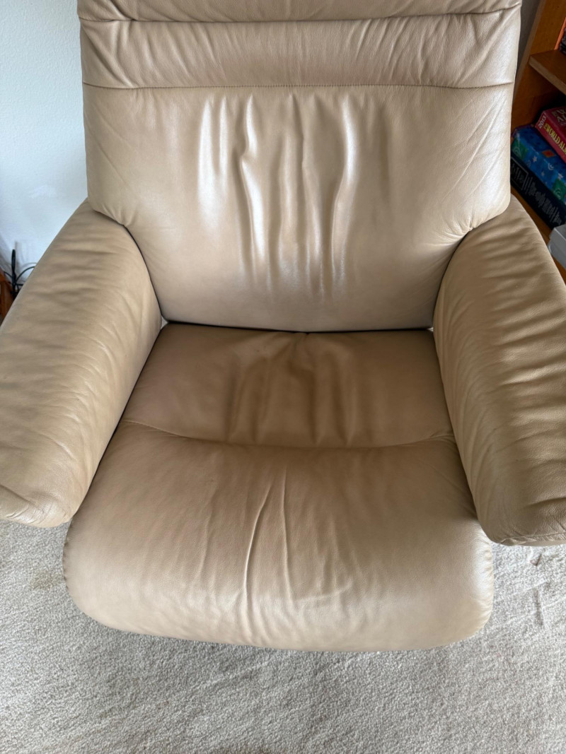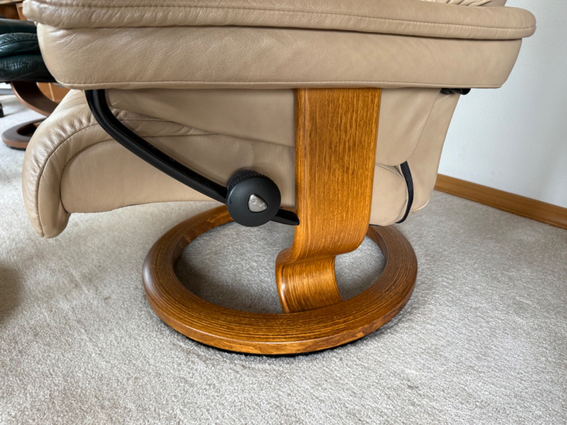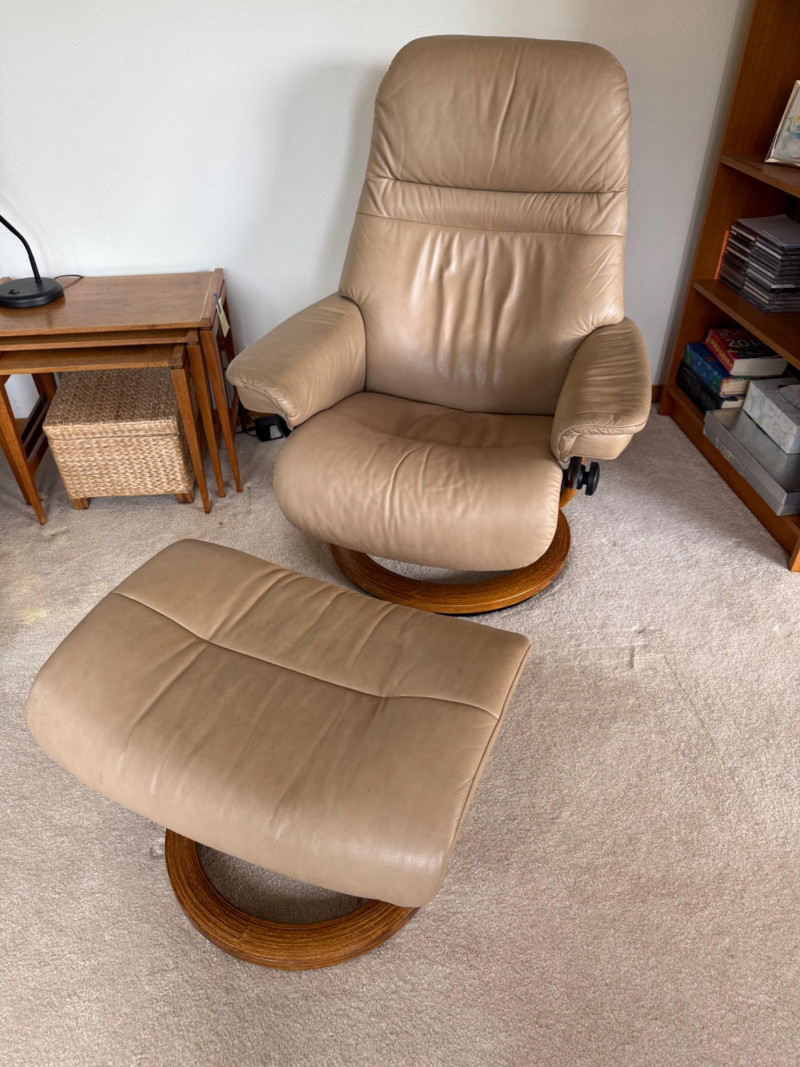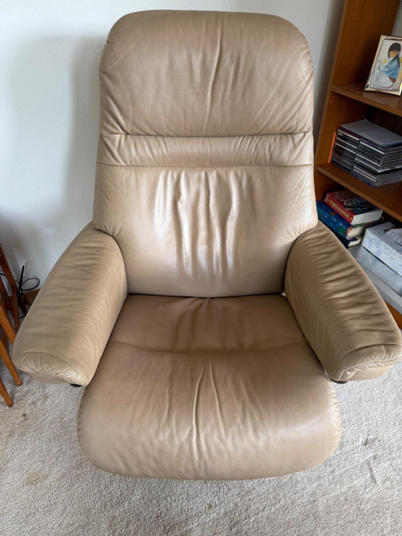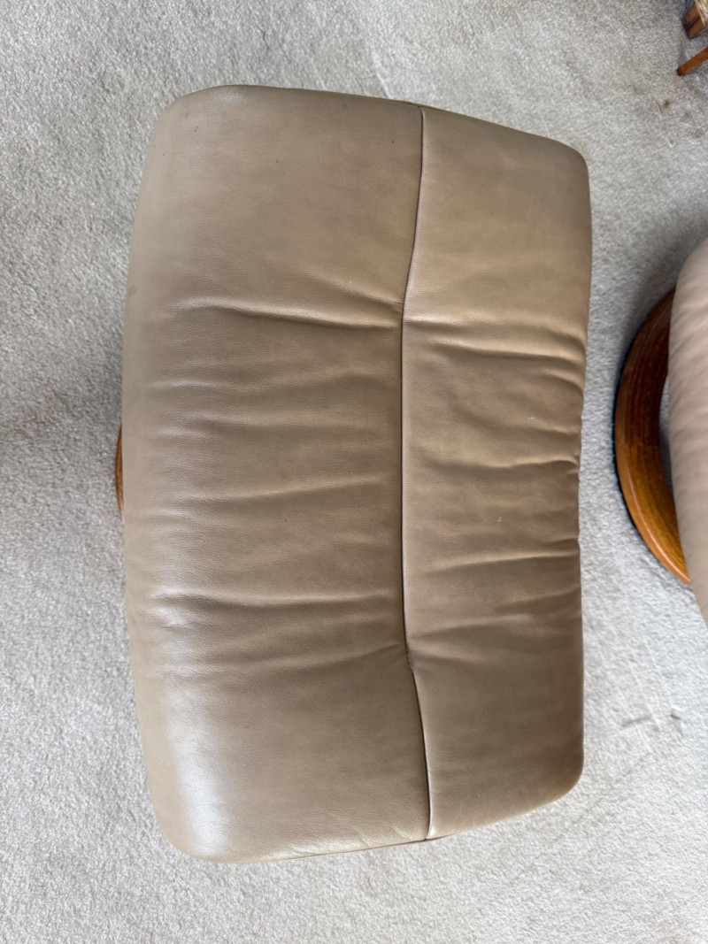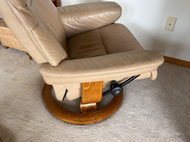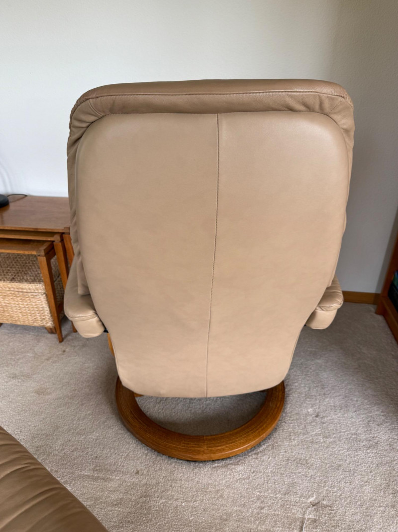 Stressless Leather Recliner Chair & Ottoman – Tan w/ Wood Base Classic tan leather Stressless recliner and ottoman set featuring the brand’s signature ergonomic design and circular wood bases. This ultra-comfortable chair measures approximately 29” wide x 38” high x 23” deep and offers adjustable reclining and swivel functionality. Crafted for both support and style, it's ideal for reading, relaxing, or elevating your living space with Scandinavian design flair.