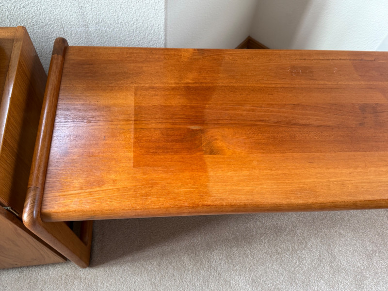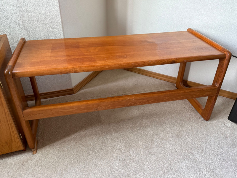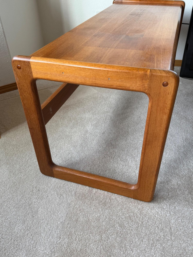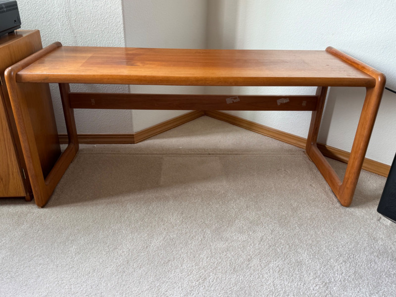 Mid-Century Modern Sculpted Wood Cocktail Table – 44.5” Wide This elegant mid-century modern coffee table features sculptural sled legs and a minimalist silhouette. Crafted from richly toned wood with smooth curves and a sturdy geometric base, it’s the perfect blend of form and function. A standout piece for any retro or contemporary space.
