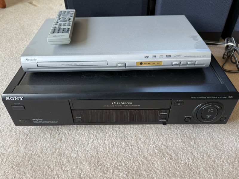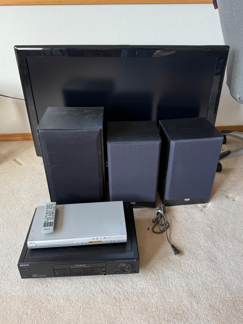 Home Theater Bundle: 40” Samsung TV, Sony VCR, DVD Player, JBL + Complete vintage AV setup! This home theater lot includes a 40” Samsung LCD TV, Sony SLV-775HF Hi-Fi stereo VCR, Memorex DVD/CD player with remote, and four external speakers—great for retro media lovers or backup entertainment use. Includes: 40” Samsung TV Sony VCR Memorex DVD player with remote (2) JBL G200 speakers Optimus STS-830 speakers