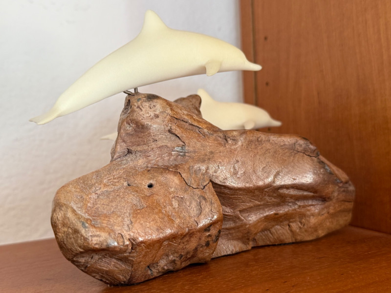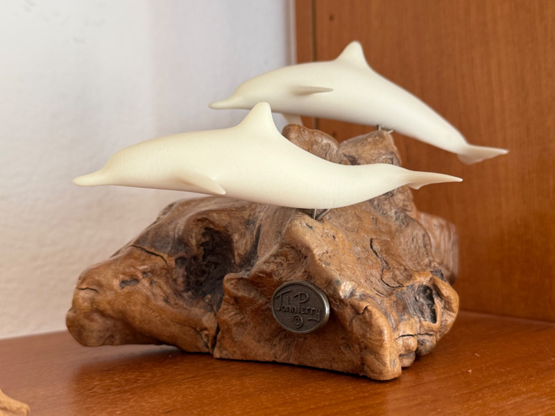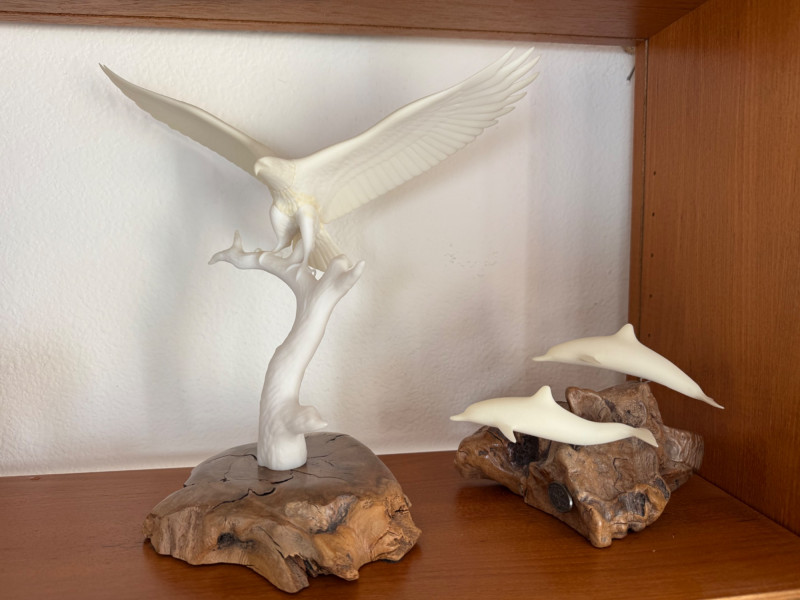 John Perry “Eagle in Flight” & “Dolphin with Calf” Sculptures – Driftwood & Porcelain Set