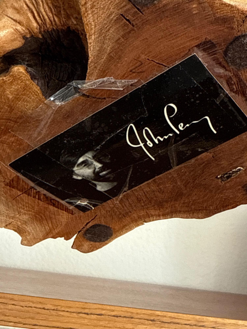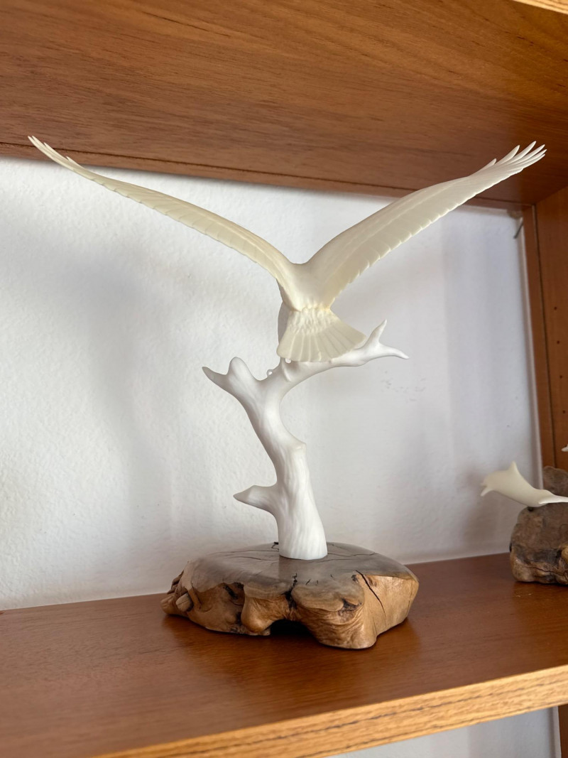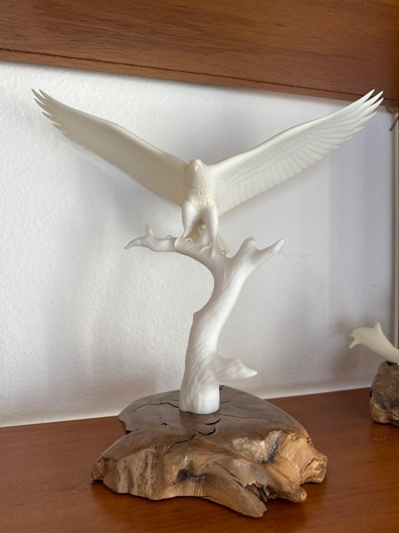 Elegant pair of original John Perry wildlife sculptures: “Eagle in Flight” – a majestic white eagle swooping down onto a driftwood-inspired branch. “Dolphin with Calf” – a graceful dolphin and its young leaping together over a natural driftwood base. Both feature Perry’s signature porcelain-like resin figures and sculptural driftwood mounts. Artist’s medallion and signature label are present on the dolphin sculpture. Stunning display pieces for lovers of ocean and wildlife art. Measurements: Eagle in Flight:Approx. 12” tall Dolphin with Calf:Approx. 4.5” tall
