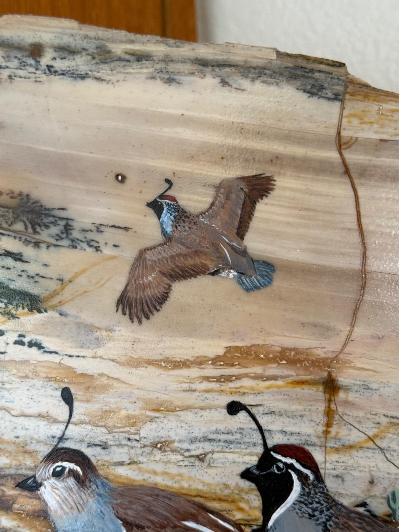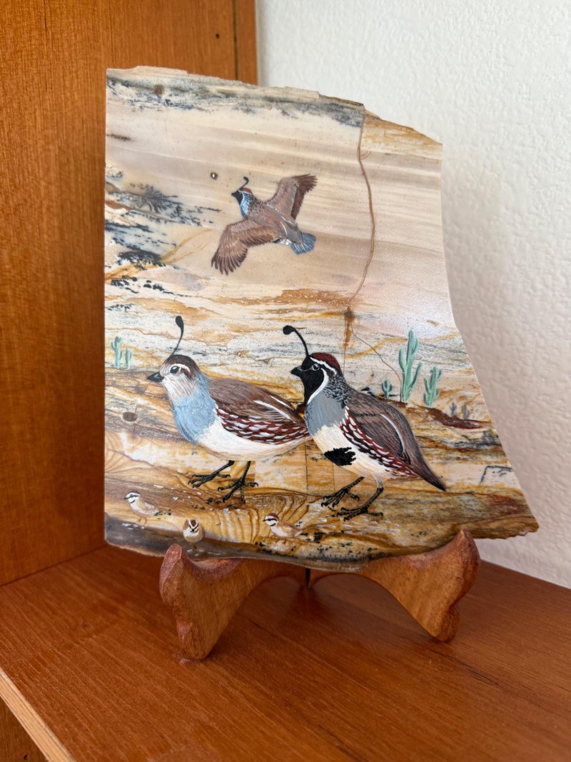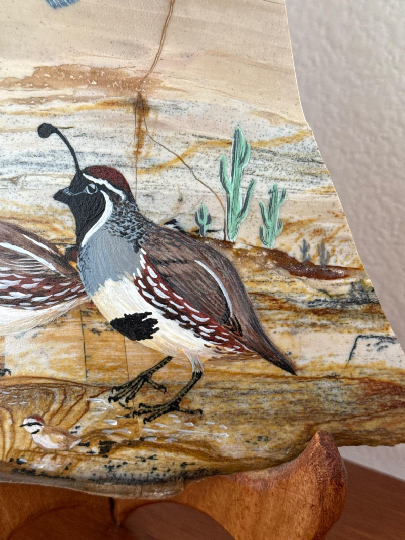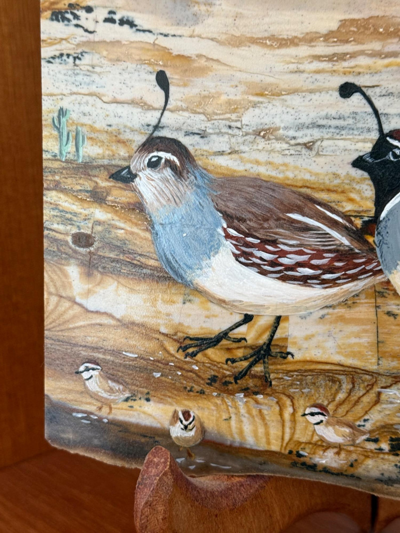 Charming and detailed wildlife painting of Gambel’s quail, hand-painted by artist B. MacFarlane on natural picture stone. The stone’s earthy, desert-toned striations serve as a stunning organic backdrop for the vibrant birds, including a pair of quail with chicks and one in flight above.