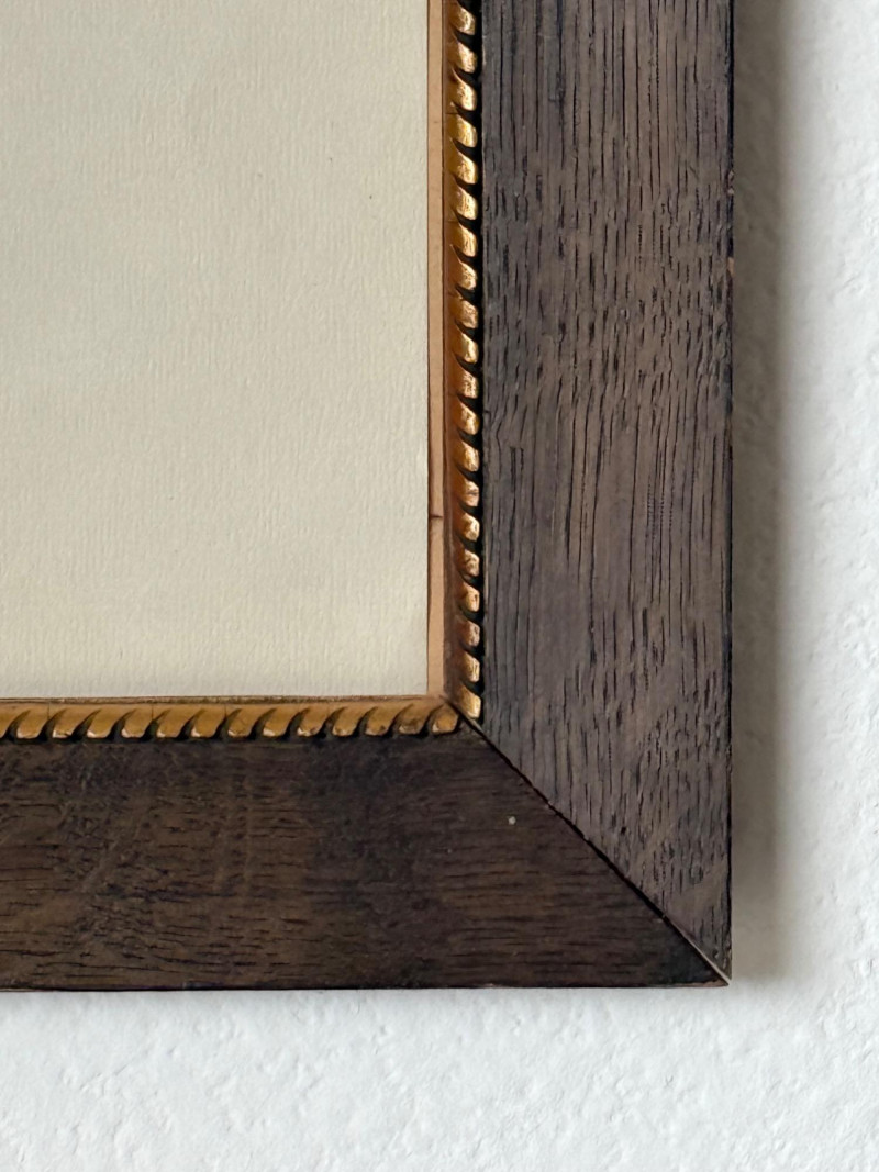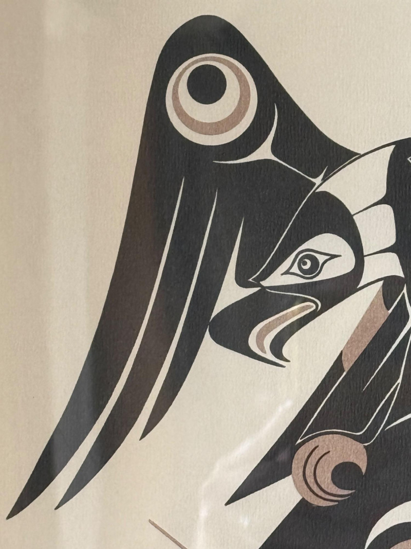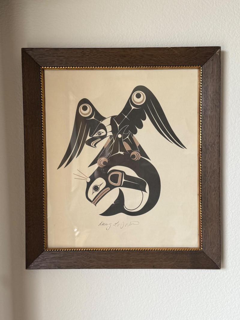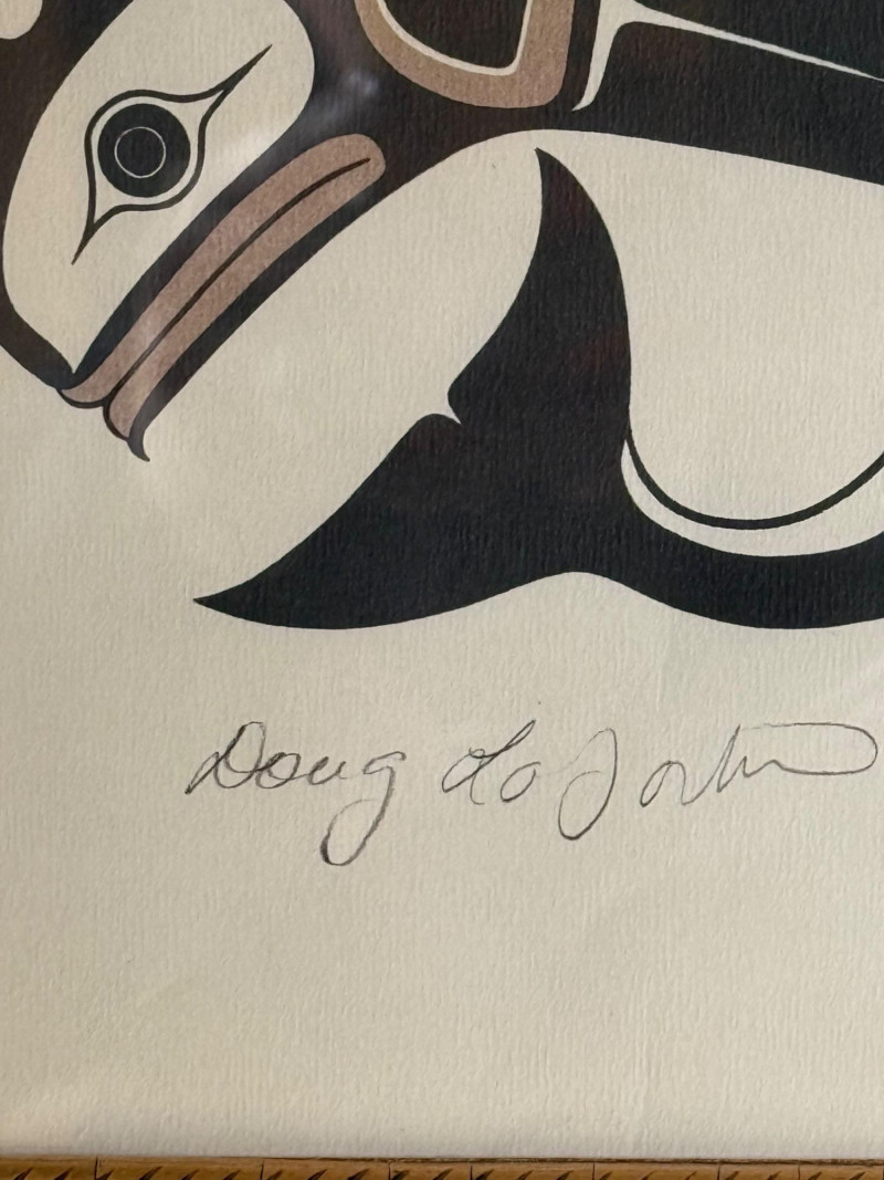 Doug Lafortune Thunderbird & Whale NW Coast Art Print, Signed Striking Northwest Coast Native art print by Doug Lafortune, titled “Whale and Thunderbird.” This bold graphic composition features traditional stylized forms in black, white, and muted brown tones. Signed in pencil by the artist below the image. Presented in a wood frame with decorative inner trim. Dimensions:14" W x 15.5" H