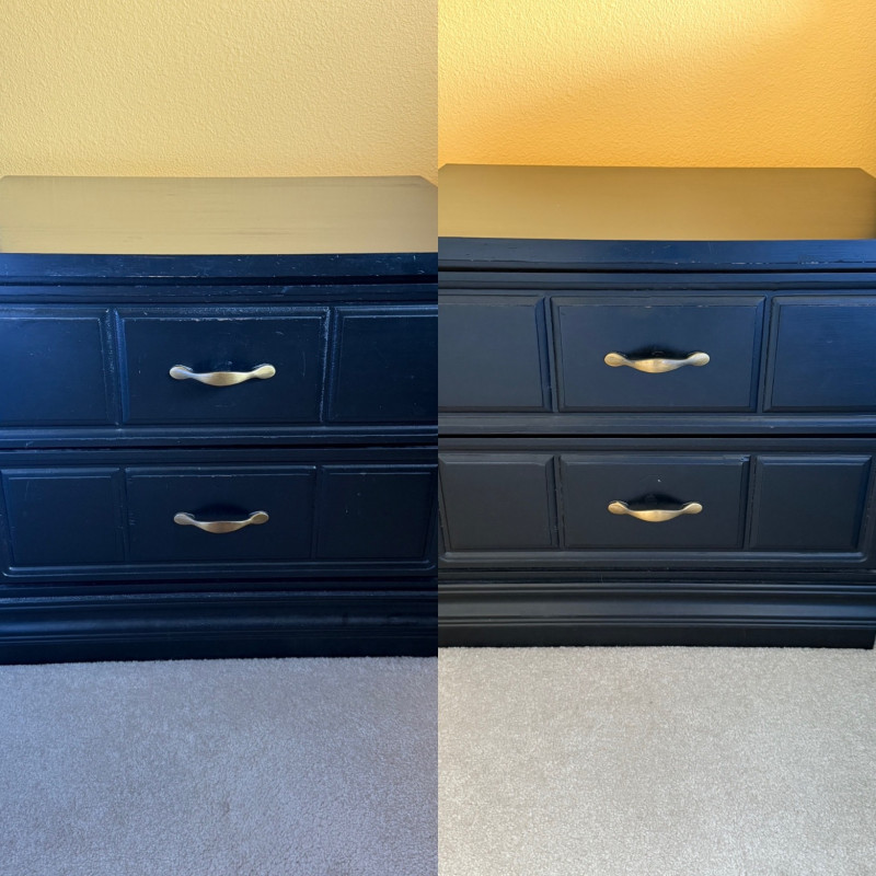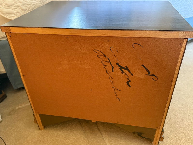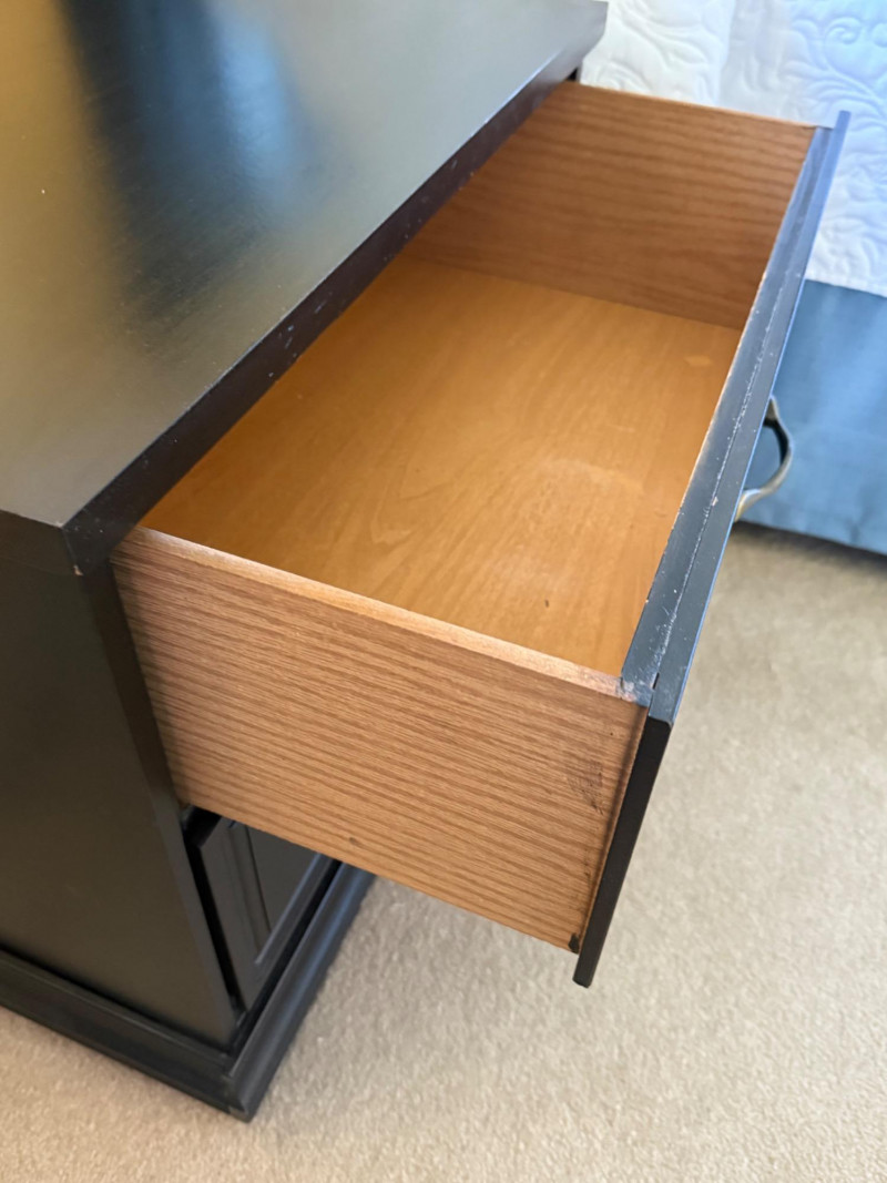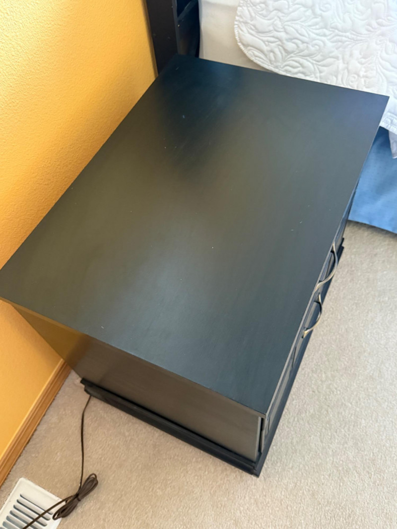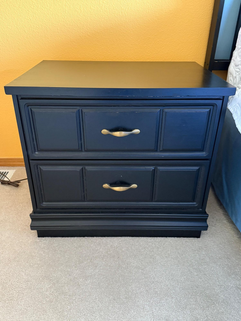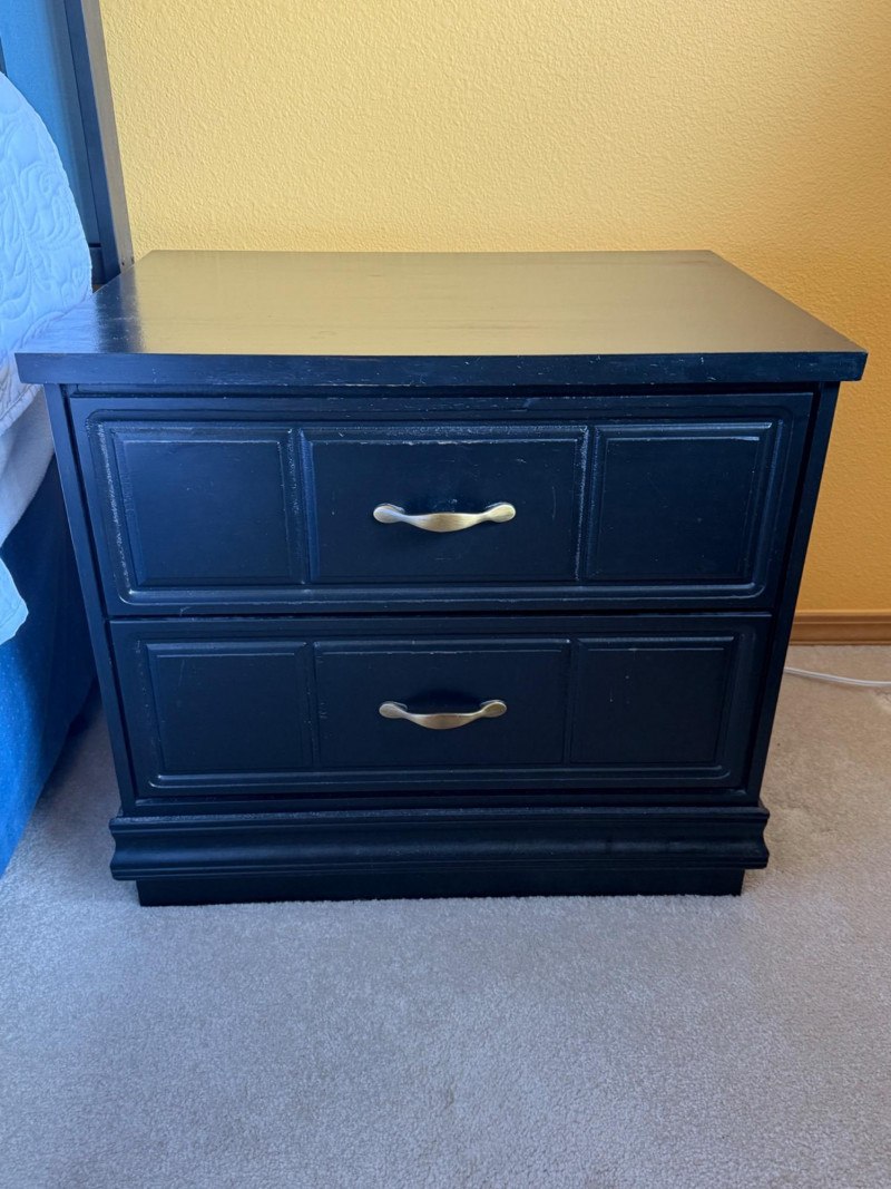 Matching pair of black-painted wood nightstands featuring paneled drawer fronts and elegant brass-tone handles. Each stand offers two roomy drawers and a stepped base for a classic look. Great as bedside tables or end tables. Markings on the back appear handwritten; minor surface wear present. Dimensions (each):24.75" W x 22" H x 17.5" D