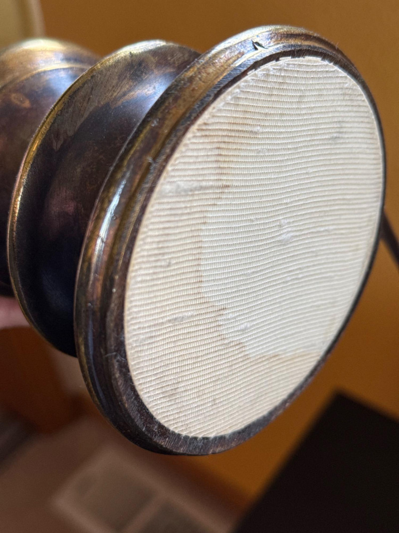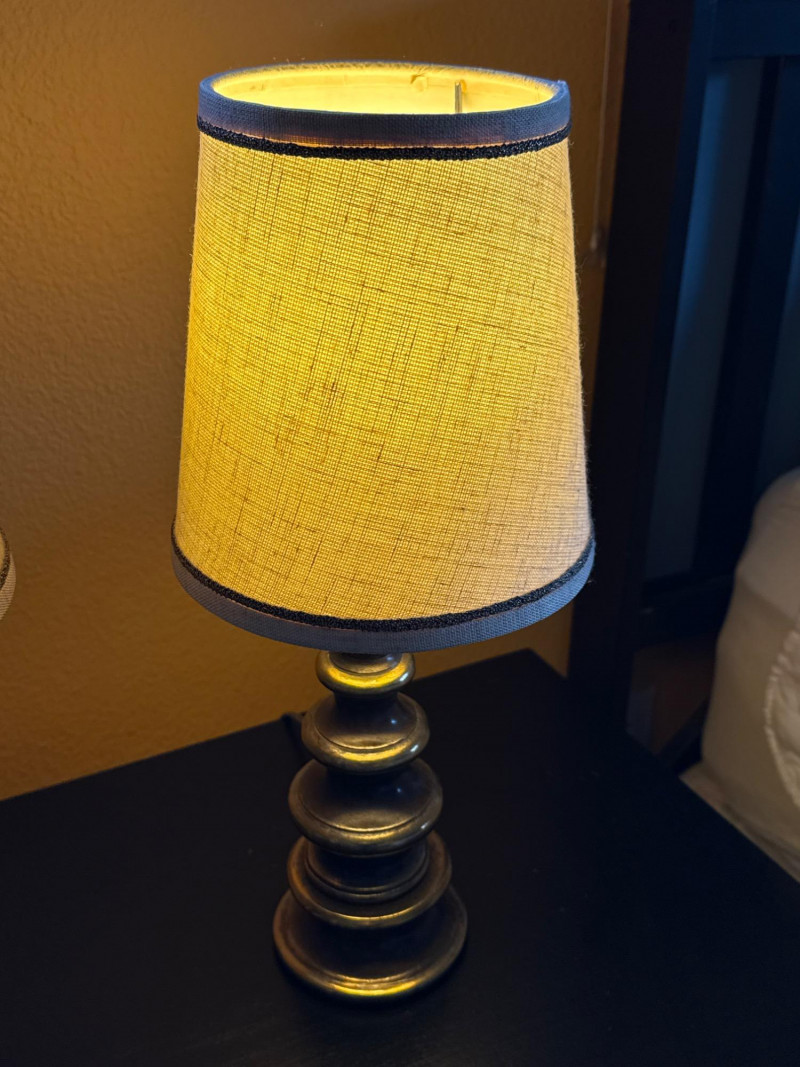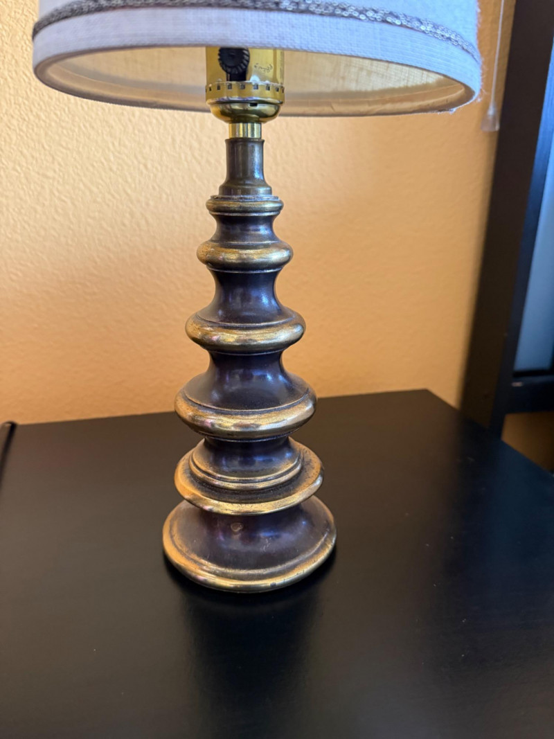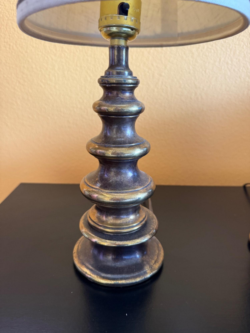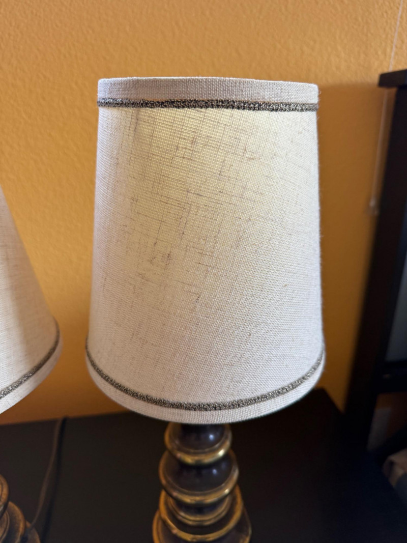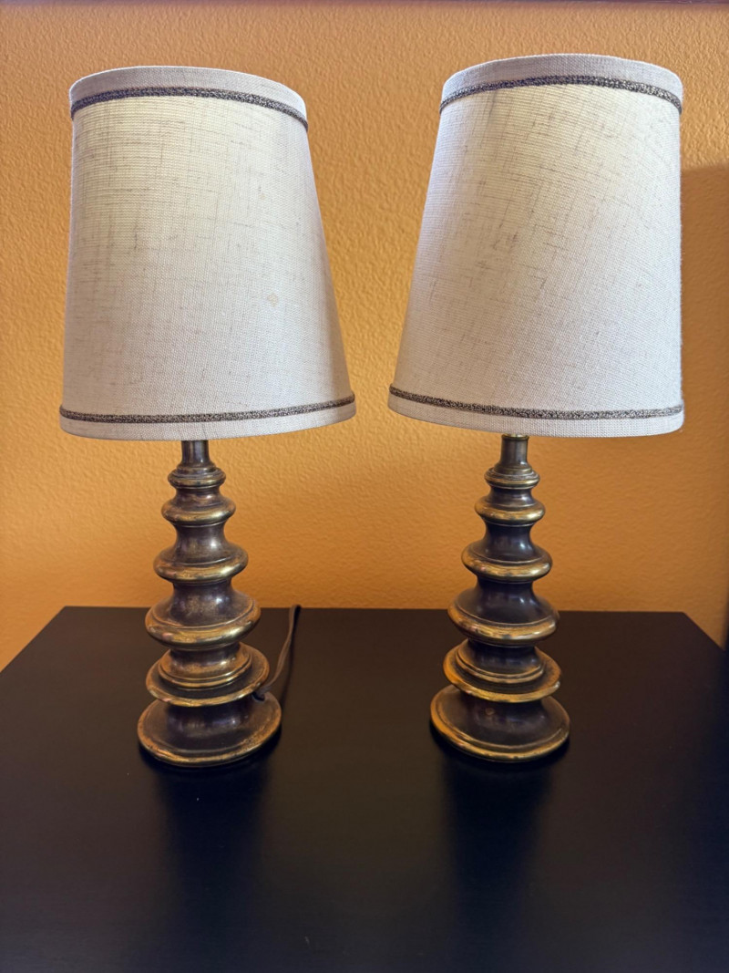 Charming pair of mid-century style table lamps featuring tiered metal bases with a distressed bronze-gold finish and original tapered linen shades. Compact and stylish, these lamps work well on nightstands, consoles, or desks. Dimensions (each):16.5" H