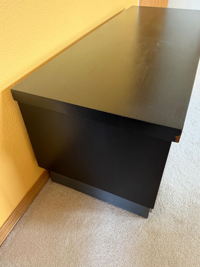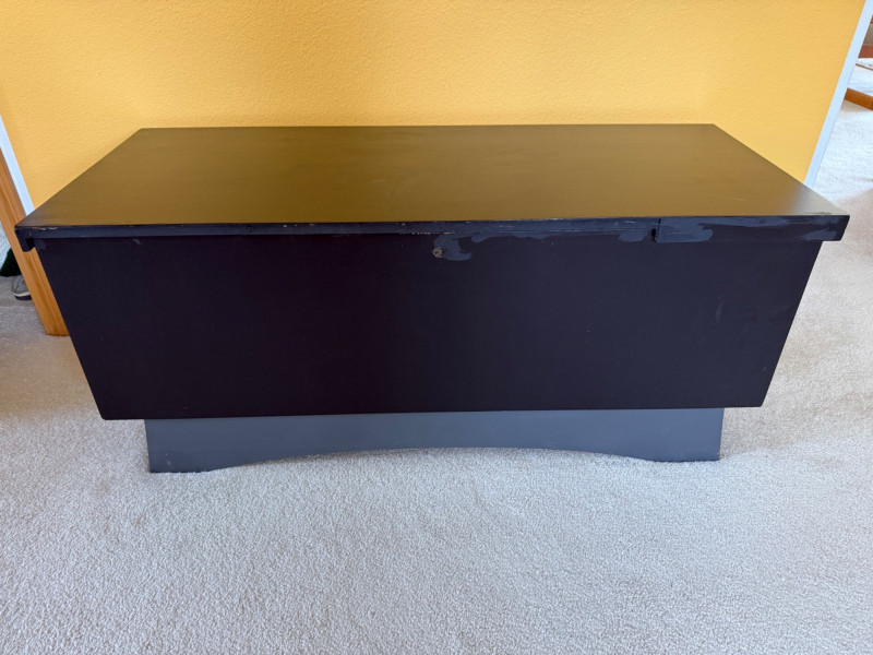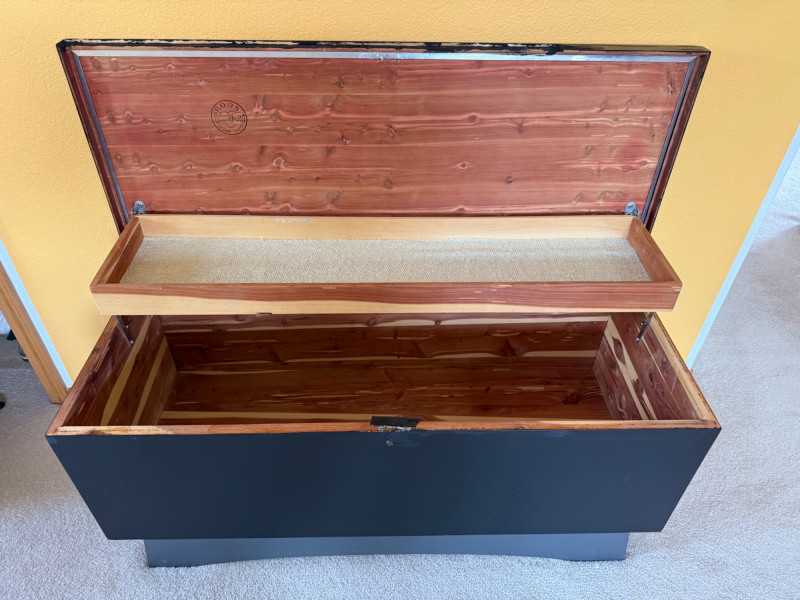 Vintage "Sweetheart" cedar chest by Roos, featuring aromatic cedar interior with original lift-out tray and stamped logo inside the lid. The exterior has been painted black, giving it a modern refresh while preserving its classic charm. Ideal for use as a blanket chest, bench, or decorative storage. Dimensions:44.5" W x 19.5" H x 18.25" D