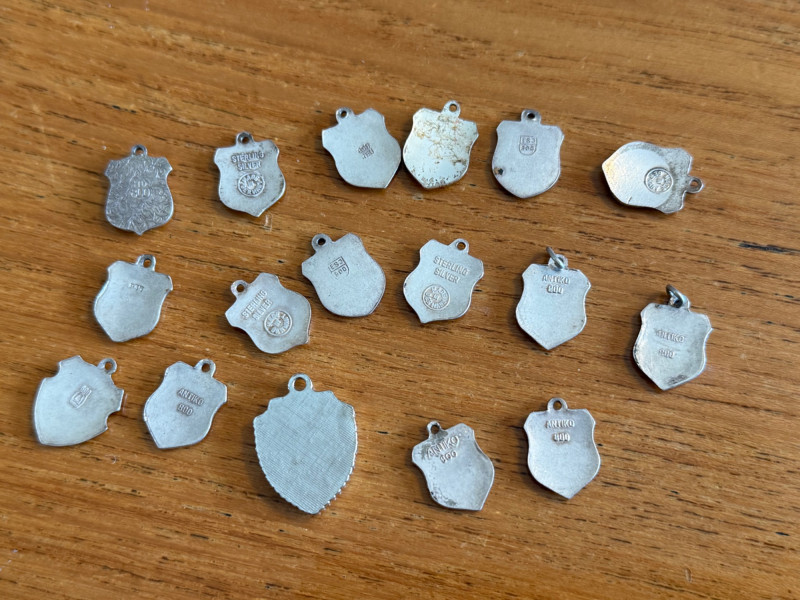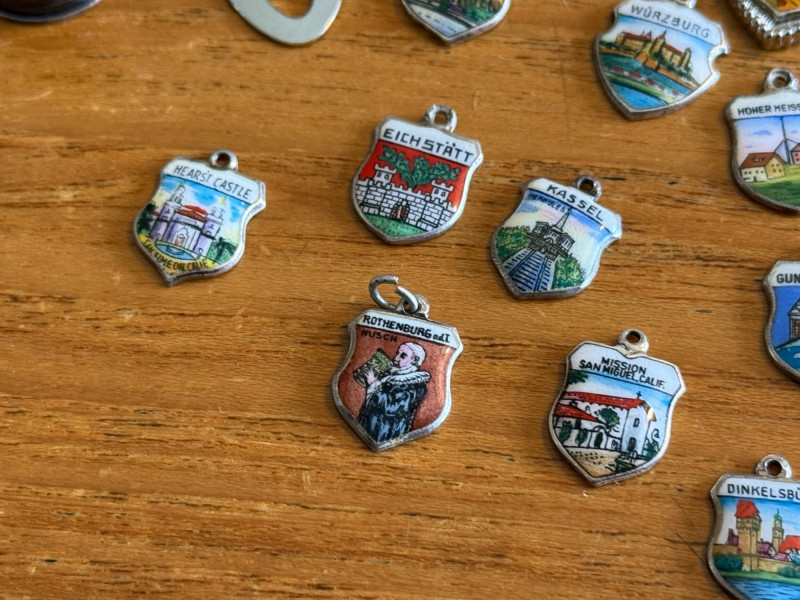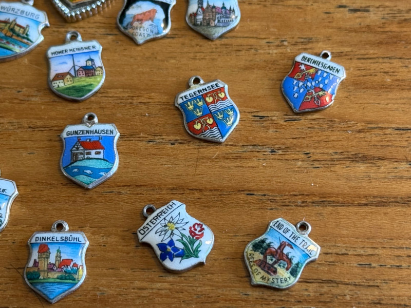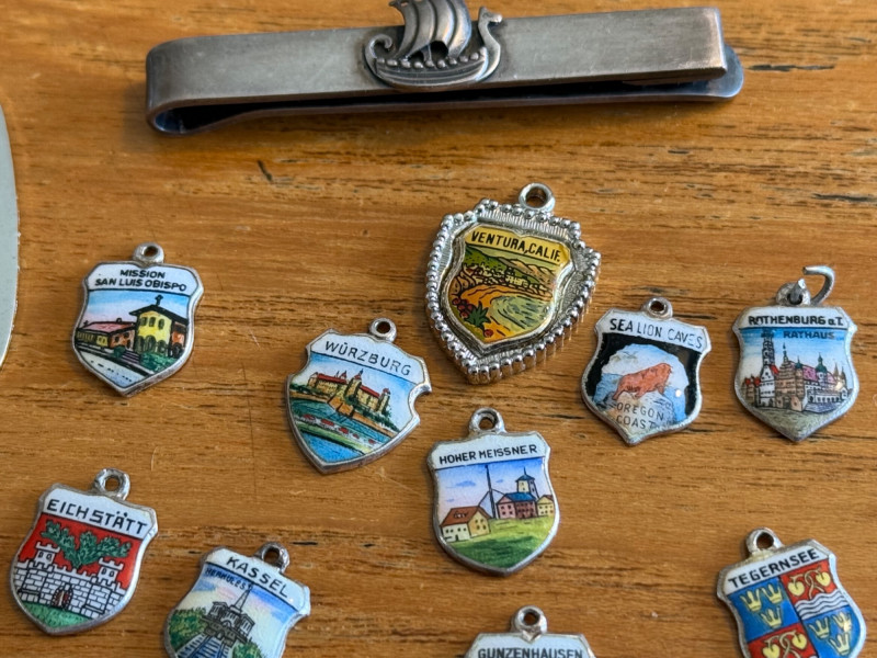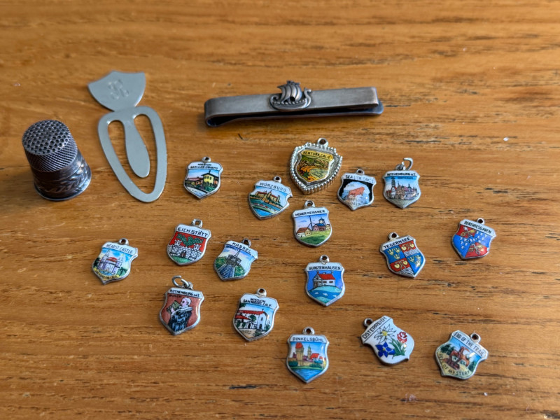 Mixed lot of vintage and sterling silver items, ideal for collectors of travel memorabilia, fine silver, or small decorative accessories. Most pieces are marked sterling or 800 silver, featuring excellent craftsmanship and vibrant enamel work. Lot Includes: 17 enamel travel shield charms, marked Sterling, 800, or Antiko – featuring German and Austrian cities Sterling Denmark tie clip with Viking ship motif, marked Danmark 392 Sterling silver bookmark marked Sterling Decorative silver thimble, marked M800