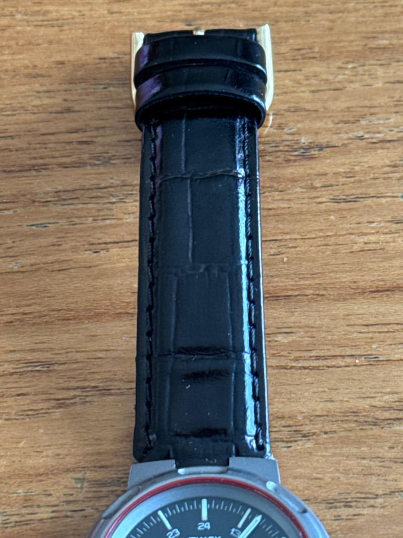 Timex 100M water-resistant titanium watch with date display and black leather band Skagen Denmark stainless steel mesh band watch with minimalist black face