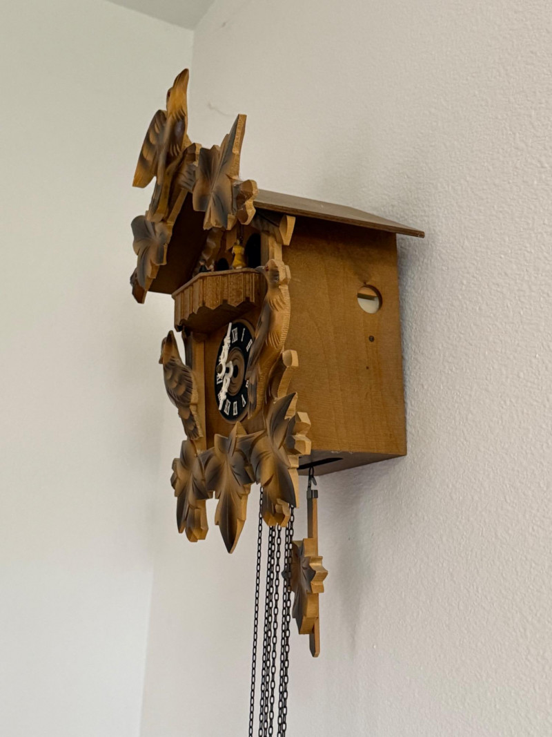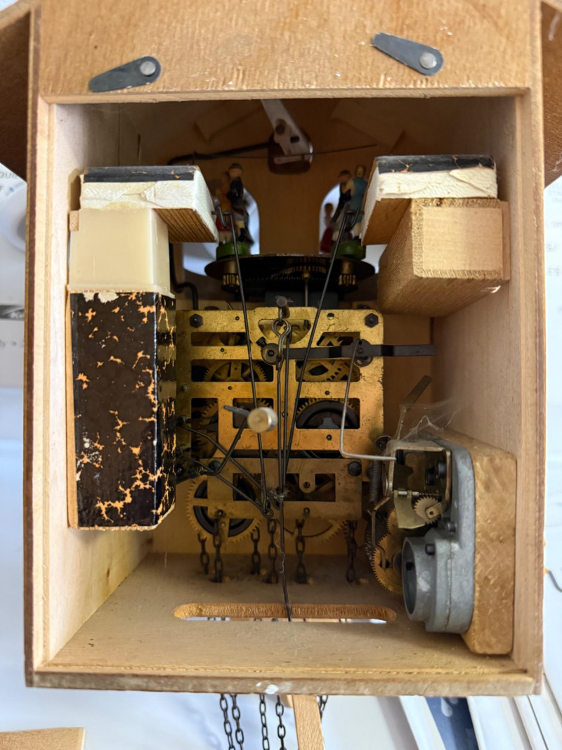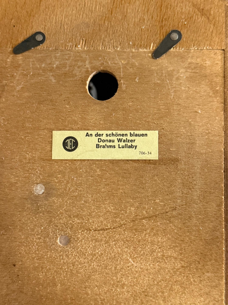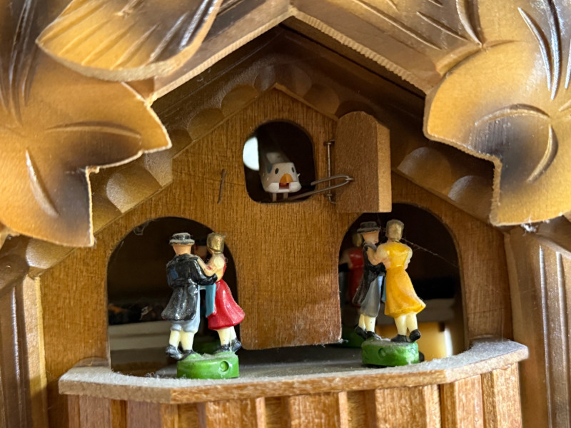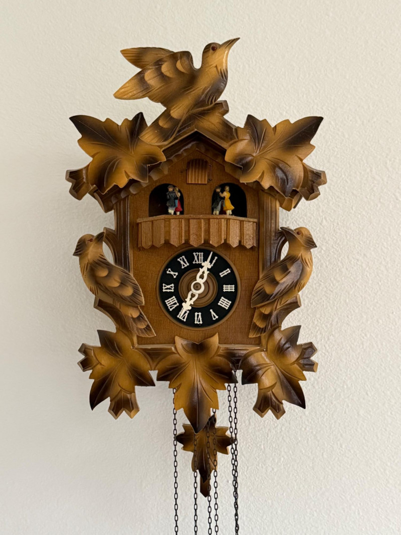Vintage German Musical Cuckoo Clock with Dancing Figurines – 14” Tall Vintage cuckoo clock featuring hand-carved birds and leaves, rotating dancing couples, and a traditional cuckoo bird that emerges on the hour. Plays “Blue Danube Waltz” and “Brahms Lullaby.” Includes all three pine cone weights. Measures approx. 14" tall x 9" wide.