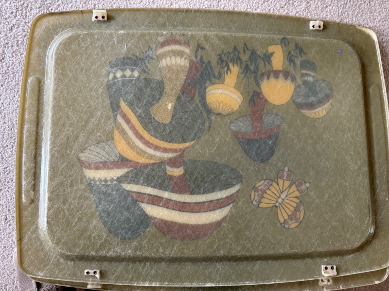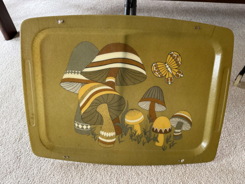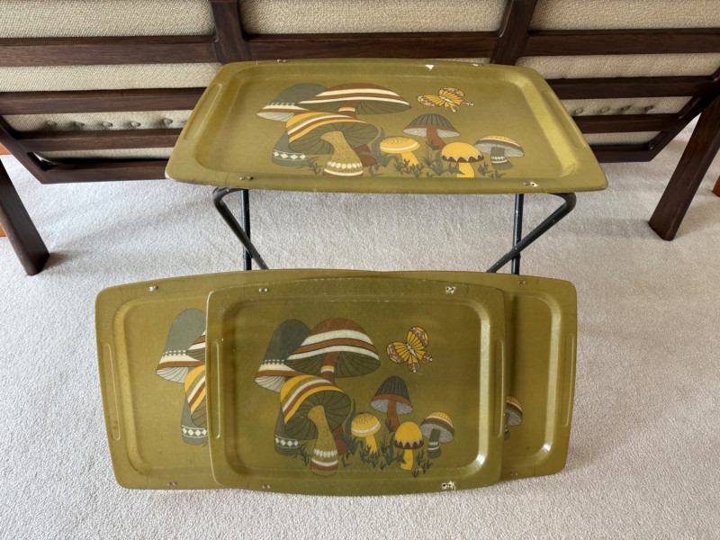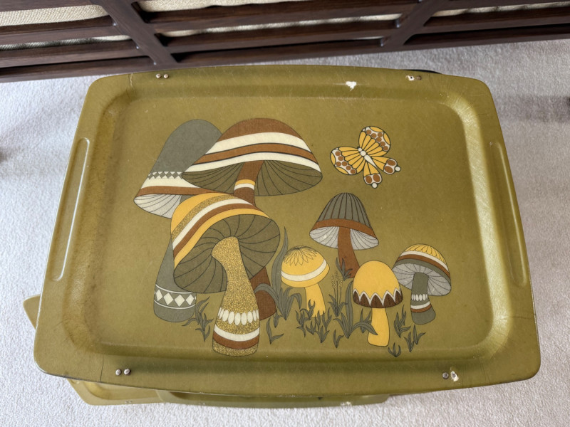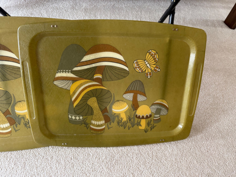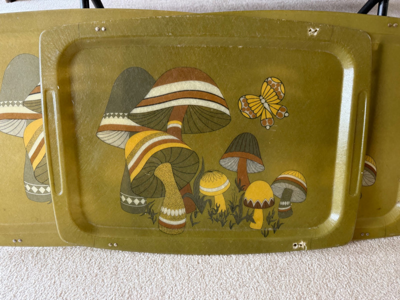 1970s retro fiberglass TV trays with colorful mushroom and butterfly motif. Set includes 4 trays and 1 metal rack. All trays have broken clips but still fit for use or display. Each tray approx. 21" wide; stand measures 25" tall x 16" deep.